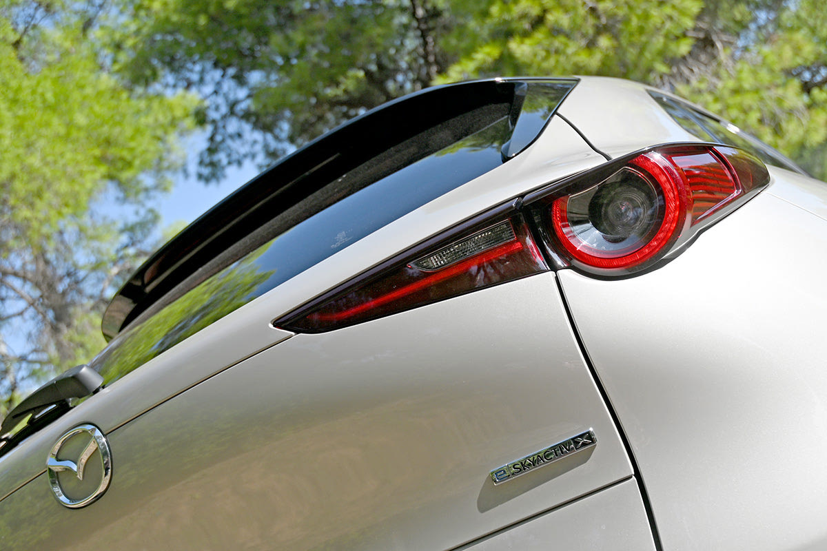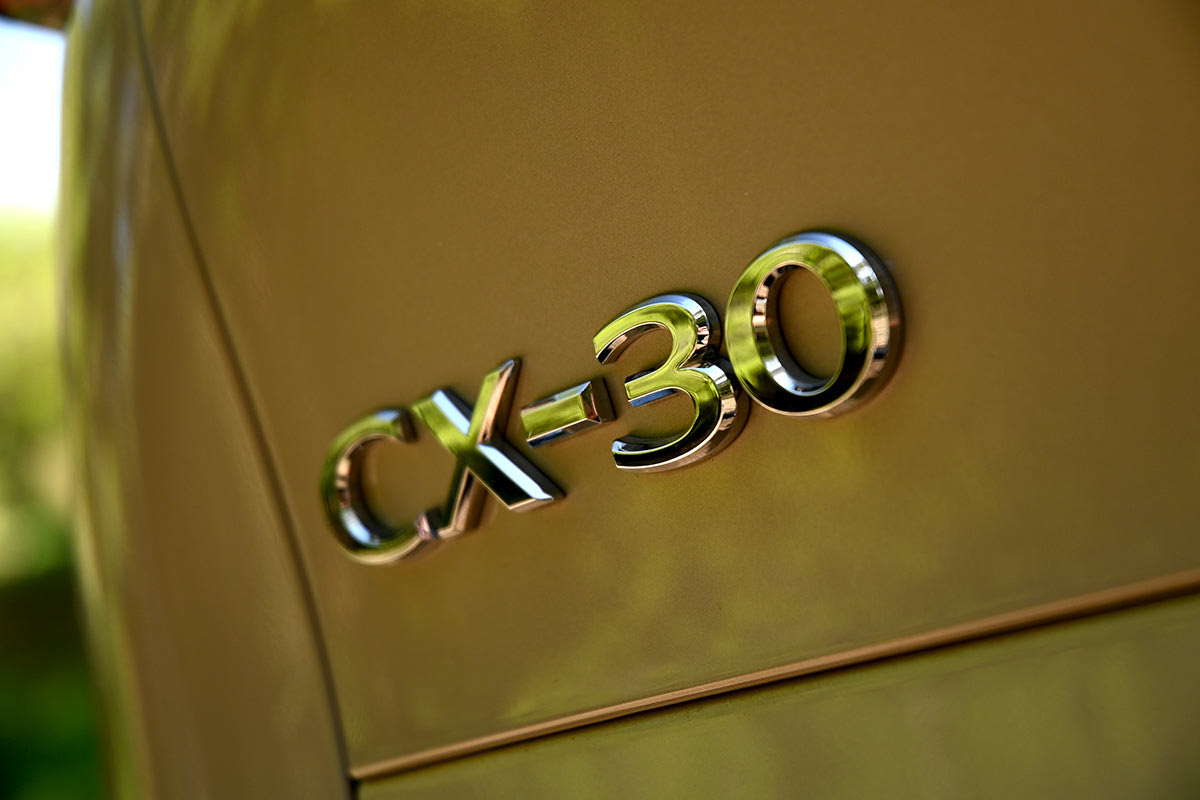 Η σιλουέτα του CX-30 μοιάζει με σπορ αυτοκίνητα μεγάλου rake, δηλαδή αυξημένης γωνίας του δαπέδου ως προς το έδαφος: χαμηλότερο ρύγχος, ψηλότερη ουρά. Στο δυναμισμό του παίζει ρόλο και η σφηνοειδής σχεδίαση της μάσκας με τη μεγάλη κυψελοειδή γρίλια, το χρωμιωμένο της πλαίσιο, τα αιχμηρά φωτιστικά σώματα εμπρός και πίσω, και βέβαια η κλίση της πίσω κολόνας.