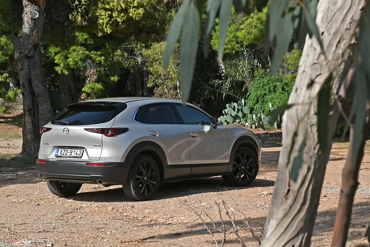 Ίσως είναι υποκειμενικό ότι το CX-30 είναι το ομορφότερο SUV της Mazda, με το χαμηλό του ρύγχος και την coupe τρίτη κολόνα, αλλά μάλλον είναι πιο κοινή παραδοχή ότι -σε αντίθεση με πολλά άλλα SUV- οδηγώντας το αισθάνεσαι κάτι. Σαν να πλανιέται εκεί λίγο το πνεύμα του ΜΧ-5, η αίσθηση του τιμονιού και του κιβωτίου του, που όποιος την έχει ζήσει δεν την ξεχνά ποτέ.