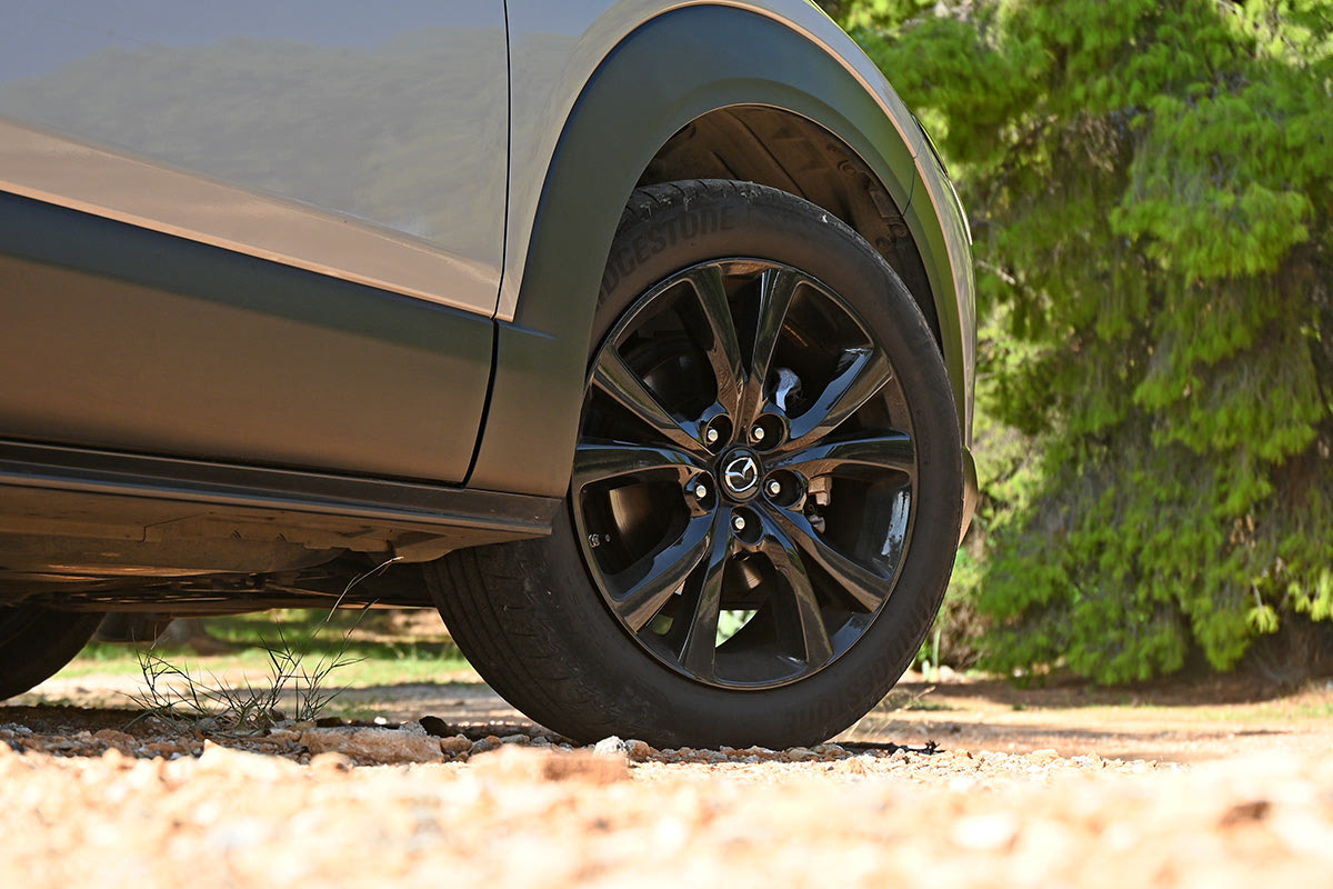 Το μαύρο χρώμα των ζαντών -με πέντε ζευγάρια ακτινών- και των καθρεπτών, χαρακτηριστικό της έκδοσης Homura, δίνουν παραπάνω δύναμη στη σχεδιαστικής φιλοσοφίας Kodo. Συνδυάζεται με το ίδιο χρώμα των πλαστικών προστατευτικών των θόλων και των μαρσπιέ, που είναι απρόσμενα μεγάλα. Αλλά σε κάθε περίπτωση αυτά είναι που δίνουν τον Crossover προσανατολισμό στο CX-30, μαζί με την αύξηση του ύψους από το έδαφος στα 17,5 εκατοστά.