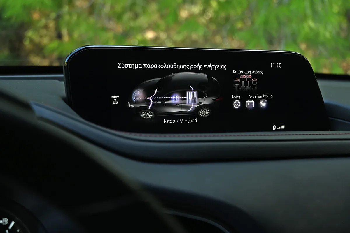 Μια άλλη ιδιαιτερότητα είναι ότι η κεντρική οθόνη των 8,8” δεν είναι αφής -είναι αρκετά μακριά από τον οδηγό για να είναι κάτι τέτοιο πρακτικό- αλλά λειτουργεί μέσω του περιστροφικού επιλογέα που βρίσκεται στο κέντρο της κονσόλας. Μια άλλη υποκειμενική άποψη, εδώ, είναι πως αυτό είναι πολύ πιο εύχρηστο και πρακτικό, από το να χειρίζεσαι με την αφή μια οθόνη εν κινήσει. Μοιάζει να σε αποσπά πολύ λιγότερο από το δρόμο – και είναι και πιο κοντά στο οπτικό πεδίο του δρόμου. Σε αυτό παίζει φυσικά ρόλο και το πολύ εύχρηστο μενού της Mazda, παρότι δεν έχει τα φαντασμαγορικά γραφικά του ανταγωνισμού.