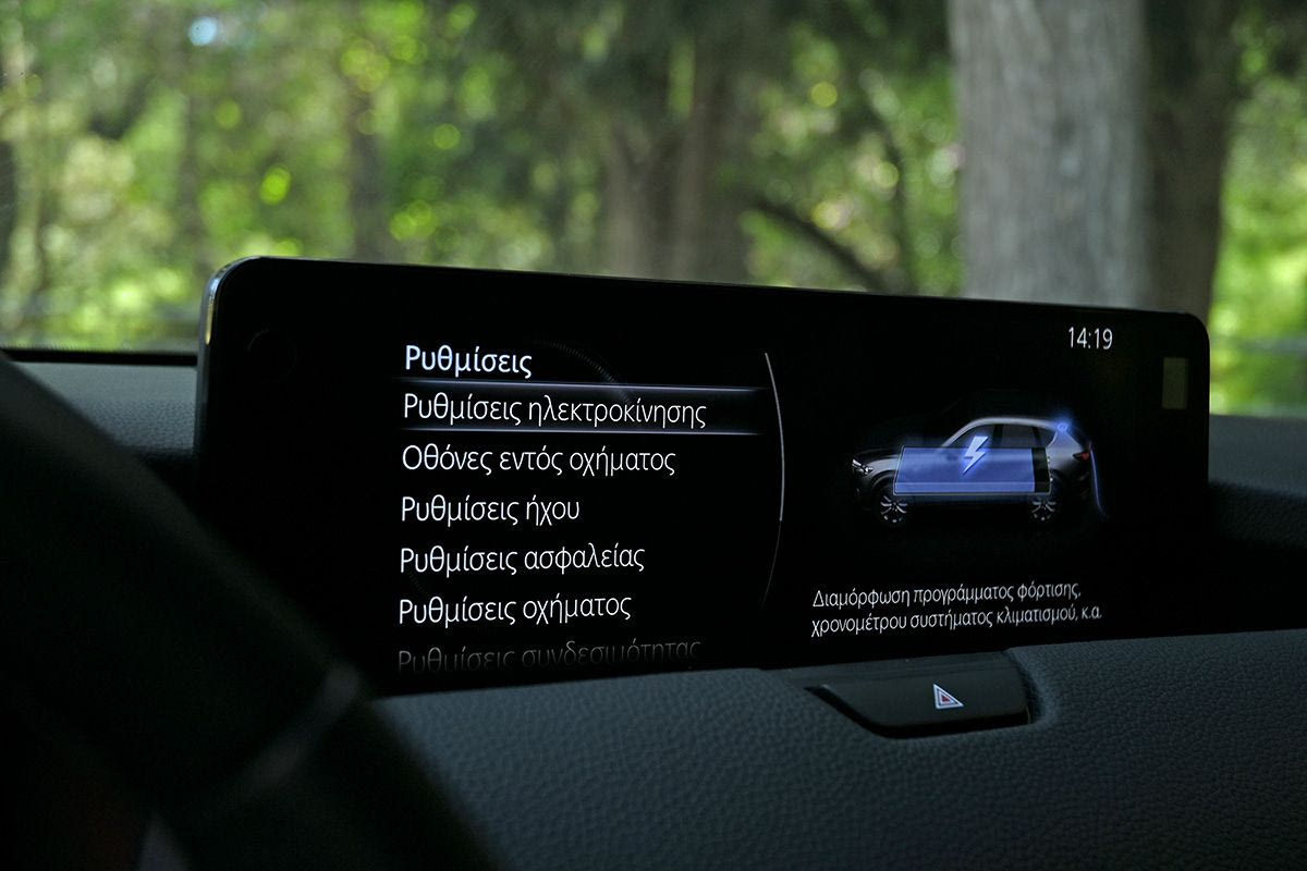 Αλλά μπορεί παράλληλα -στην άλλη του πλευρά- να κάνει σε ρεαλιστικές συνθήκες της καθημερινότητας και αθόρυβα περισσότερα από 50 χιλιόμετρα (συνολικά 63 χλμ., σύμφωνα με τη Mazda), με ταχύτητα έως και 100 km/h, με κάθε φόρτιση της μπαταρίας των 17,8 kWh. H κατανάλωση, στην περίπτωση αυτή, είναι της τάξης των 28,6 kWh/100 km.