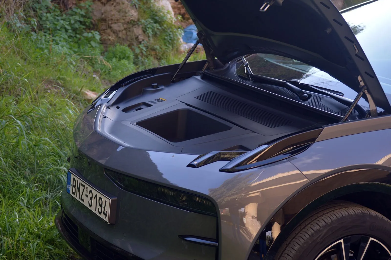 Για την περίπτωση που κάτι προκύψει και το ηλεκτρονικό σύστημα δεν θα είναι σε θέση να εξυπηρετήσει, χαμηλά στις επενδύσεις των θυρών, υπάρχει και ένας μοχλός, για το συμβατικό άνοιγμα των θυρών. Όμορφες λεπτομέρειες που δείχνουν πως έχει γίνει αρκετή μελέτη για τον τρόπο με τον οποίο μπορεί να διαφοροποιηθεί ένα μοντέλο στη δύσκολη αυτή κατηγορία. Σε αυτές πρέπει να λογίζεται και το frunk– που αποκαλύπτεται με ελάχιστη προσπάθεια αφού το εμπρός καπό στηρίζεται σε αμορτισέρ και ναι μεν είναι μικρό, ίσα-ίσα για τα καλώδια φόρτισης αλλά είναι εκεί, περιποιημένο, να τονίζει πως η συνολική κατασκευή είναι premium σε βάθος.