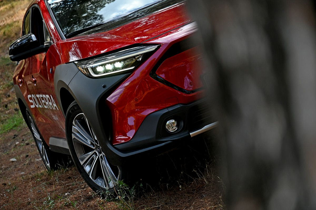Στη γεμάτη αιχμές και νευρώσεις μεταλλική επιφάνεια του Solterra ο “περιπετειώδης” χαρακτήρας του -εκτός από το αυξημένο ύψος από το έδαφος- εκφράζεται με τα πλαστικά προστατευτικά στους θόλους των τροχών (που εμπρός συνδέονται με τα φωτιστικά σώματα), στους προφυλακτήρες και στα μαρσπιέ. Όμως, αυτά υπάρχουν και στο bZ4X, όπως και οι πανομοιότυπες ζάντες 20 ιντσών (18’’ στη βασική έκδοση).