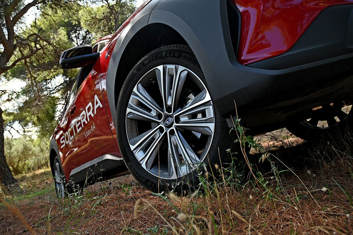 Επίσης, το στήσιμο της ανάρτησης -με διπλά ψαλίδια πίσω!- δεν θα έπρεπε να διαχειριστεί τον βαρύ βενζινοκινητήρα στο ρύγχος και τα βαριά διαφορικά στο δάπεδο, αλλά τώρα μια υπέρβαρη μπαταρία που καλύπτει όλο το πάτωμα. Η όλη γεωμετρία άλλαξε ριζικά, αλλά η Subaru την έφερε στα μέτρα της. Το Solterra διατίθεται αποκλειστικά και μόνο ως 4×4.