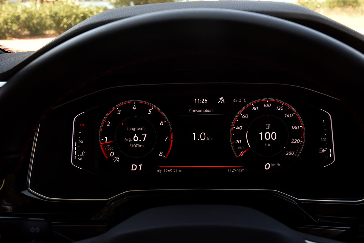 Κατ’ αρχήν και οι δύο οθόνες -για τον πίνακα οργάνων και τα πολυμέσα- στην ενιαία μαύρη γυαλιστερή επιφάνεια είναι ευμεγέθεις: η πρώτη, TFT, έχει διαγώνιο 10,3’’ και η δεύτερη οθόνη αφής στο κέντρο του ταμπλό 8,0 ιντσών. Το δερμάτινο τιμόνι με διάτρητες πλευρές και ο δερμάτινος επιλογέας έχει κόκκινες ραφές, αντίστοιχες των εκλεπτυσμένων καρό καθισμάτων. Αυτές είναι οι σπορ -επίσης διακριτικές- παρεμβάσεις του εσωτερικού, που συνδυάζονται με το λογότυπο GTI και τις κόκκινες λεπτομέρειες του τιμονιού και στο εσωτερικό μέρος των μαρσπιέ.