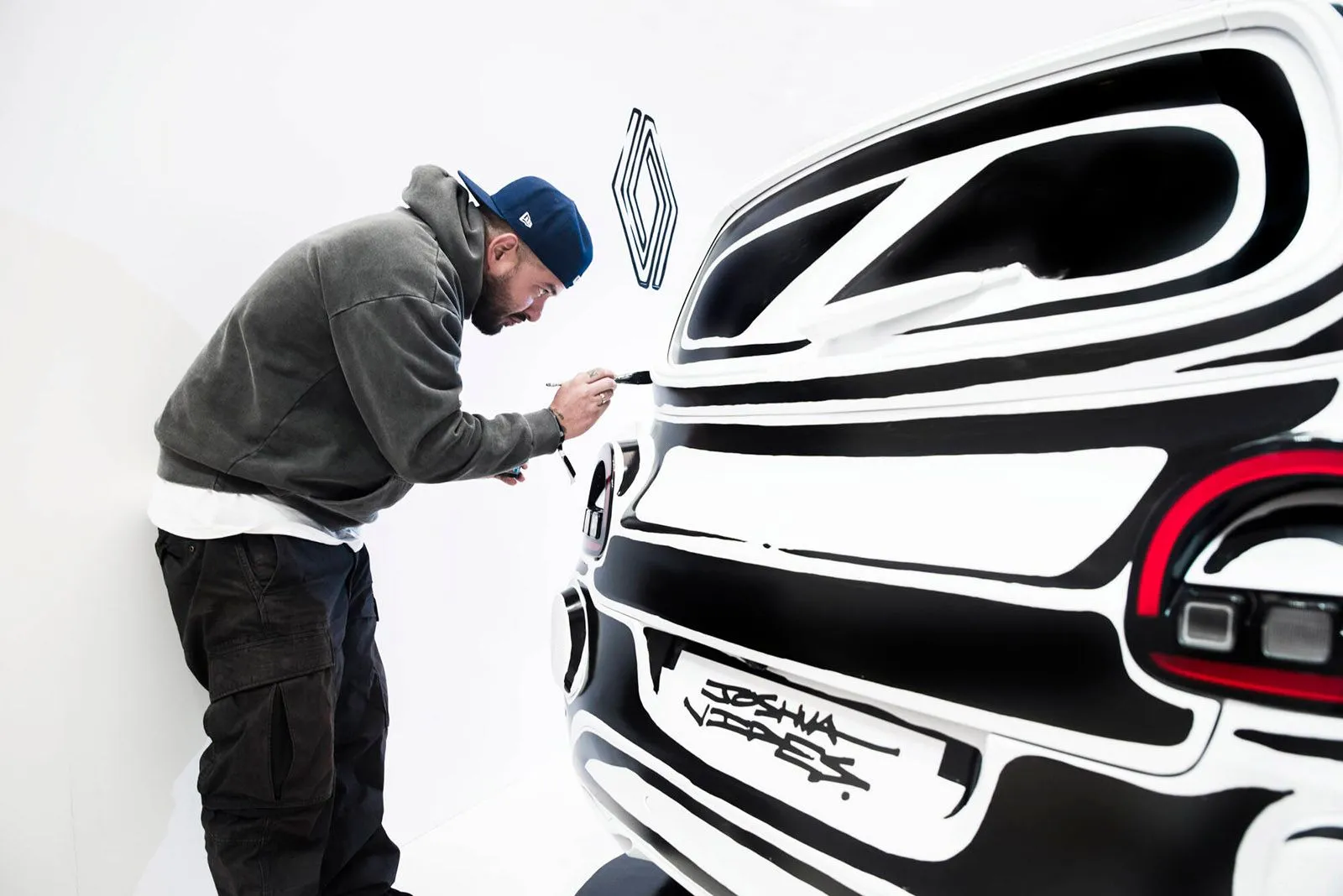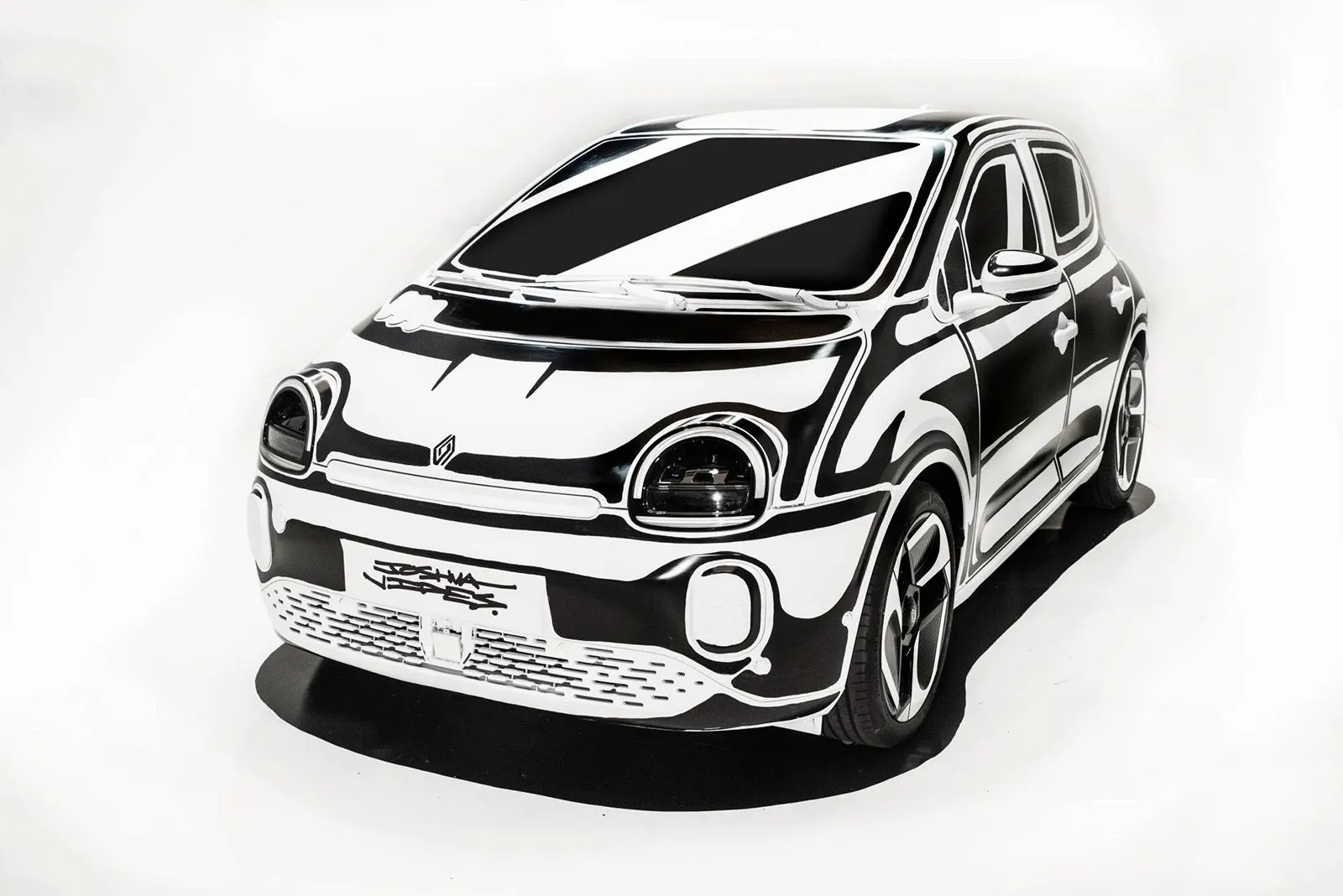 Ο Αμερικανός εικαστικός Joshua Vides συστήνει εκ νέου το Twingo E-Tech Electric μέσα από μια αυθεντική καλλιτεχνική δημιουργία. Σε δύο συνεδρίες ανοιχτές στο κοινό μεταμόρφωσε το Twingo σε μια “σχεδιαστική ψευδαίσθηση”, αποτυπώνοντας το εμβληματικό ασπρόμαυρο γραφιστικό του ύφος. To νέο Renault Twingo E-Tech αναμένεται στην Ελλάδα στα τέλη Μαΐου.