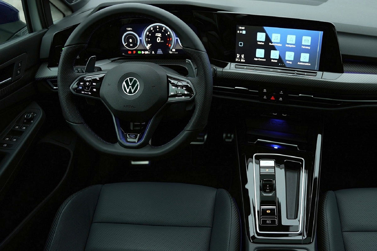 Η σπορ φιλοσοφία αποτυπώνεται και στο εσωτερικό. Για πρώτη φορά σε ένα Volkswagen παραγωγής, το ταμπλό και οι επενδύσεις στις πόρτες διαθέτουν διακοσμητικά στοιχεία Genuine Carbon από γνήσια ανθρακονήματα. Το Golf R “20 Years” φέρει επίσης μπλε λογότυπα R, συμπεριλαμβανομένου και αυτού στο κάτω μέρος του σπορ τιμονιού πολλαπλών λειτουργιών. Το μπλε λογότυπο R φιλοξενείται επίσης στο κλειδί του αυτοκινήτου.