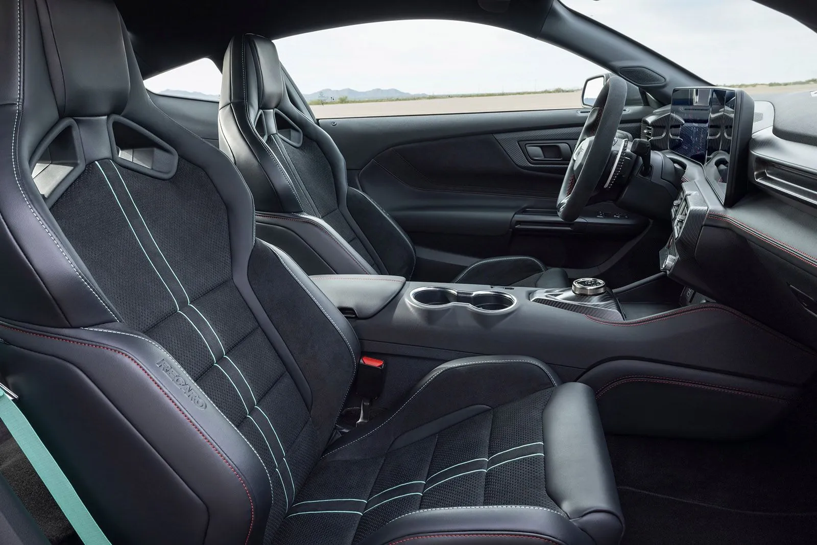 Επίσης, η νέα Mustang Dark Horse SC διαθέτει το δερμάτινο τιμόνι της Mustang GTD – με επίπεδη διαμόρφωση στο κάτω μέρος, ειδική σήμανση στη θέση της ευθείας, ενσωματωμένα χειριστήρια με λεπτομέρειες από carbon και επένδυση στεφάνης από Alcantara.