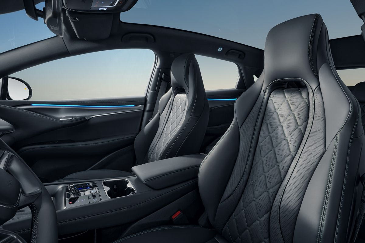 Η δομή Cell-to-Body και η συμπαγής Blade Battery εξασφαλίζουν ένα σχετικά λεπτό δάπεδο για ένα EV τόσο μεγάλης αυτονομίας, επιτρέποντας γενναιόδωρο χώρο για το κεφάλι, παρά την επικλινή γραμμή της οροφής. Όπως αρμόζει σε ένα μοντέλο της σειράς Ocean Series, το ταμπλό του Sealion 7 συνδυάζει την τυπική υψηλή τεχνολογία της BYD με ρέοντα σχήματα και μια κεντρική κονσόλα δύο επιπέδων που εξασφαλίζει ιδιαίτερη κομψότητα.