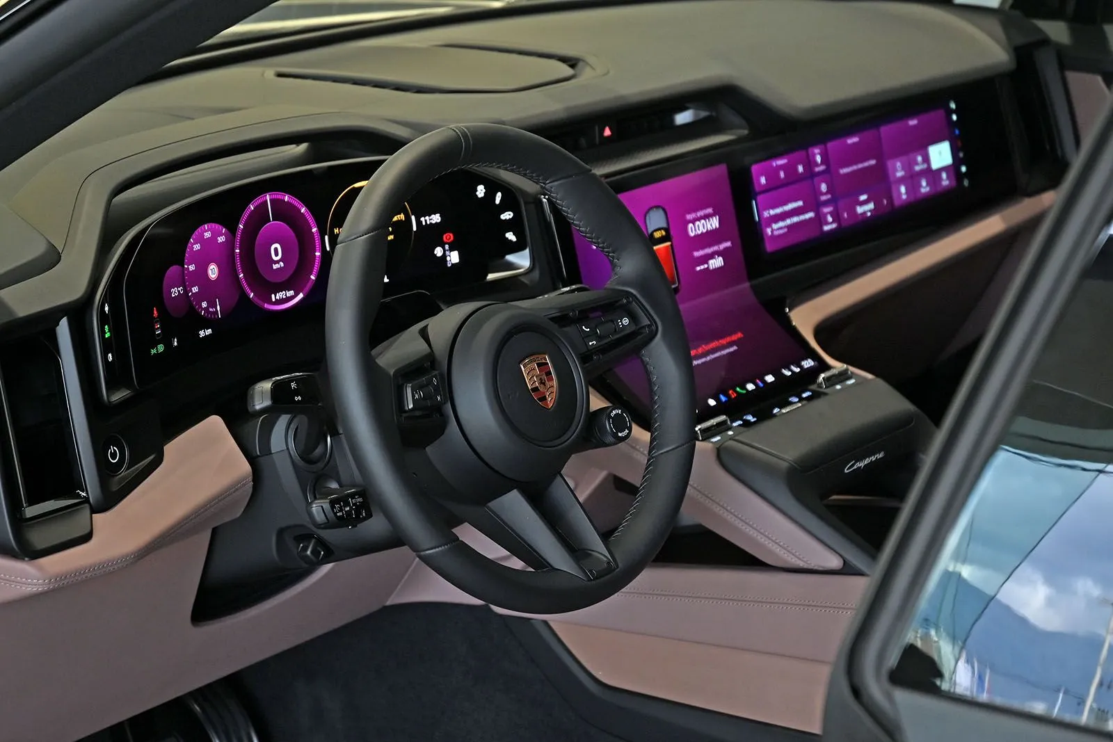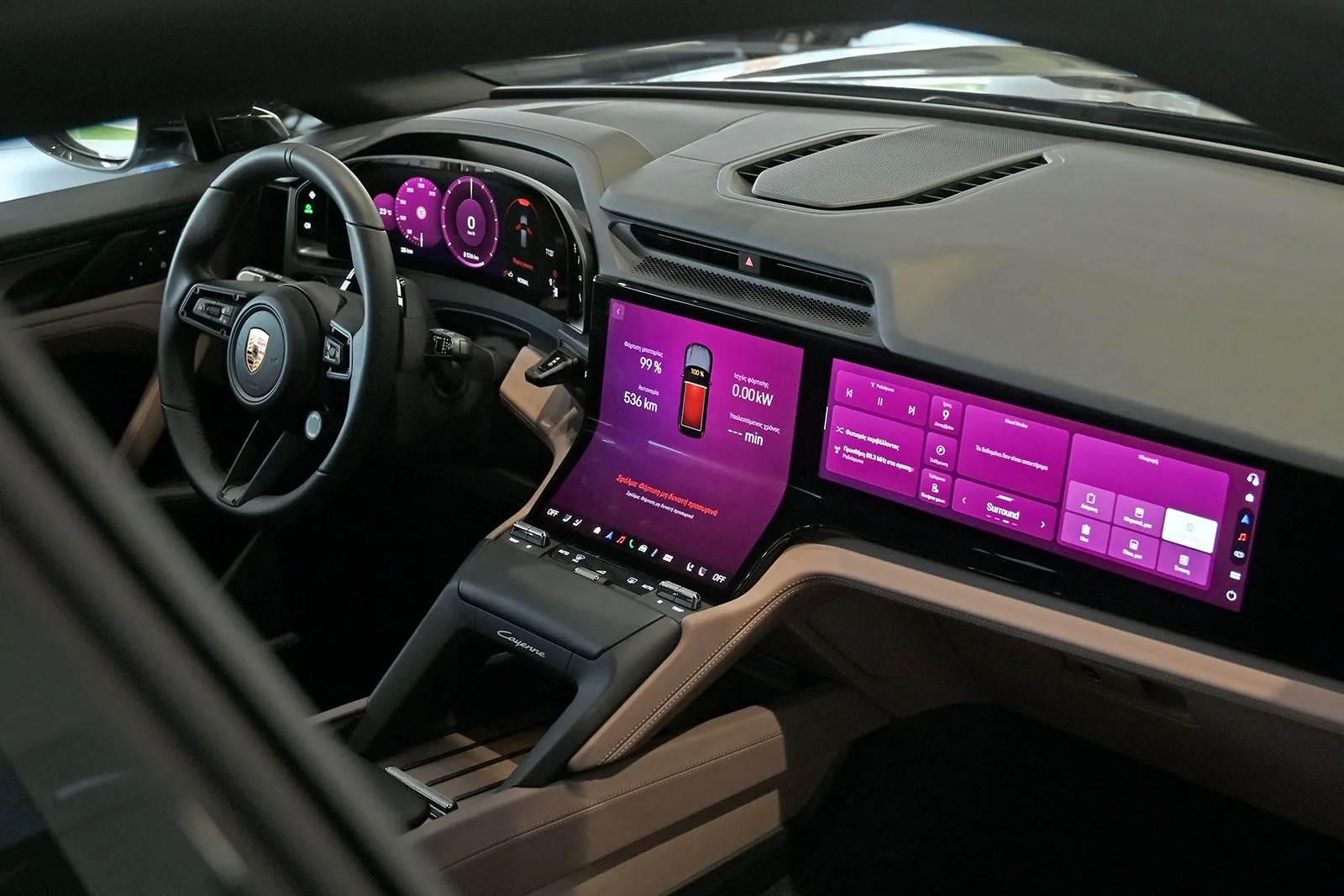 Μια από τις πιο εντυπωσιακές πτυχές της Cayenne Electric είναι το ψηφιακό, φουτουριστικό εσωτερικό. Στο επίκεντρο της νέας φιλοσοφίας Porsche Driver Experience βρίσκεται η οθόνη Flow Display – μια κομψή καμπυλωτή οθόνη OLED, που συμπληρώνεται από τον ψηφιακό πίνακα οργάνων με τεχνολογία OLED 14,25 ιντσών και προαιρετική οθόνη συνοδηγού 14,9 ιντσών.