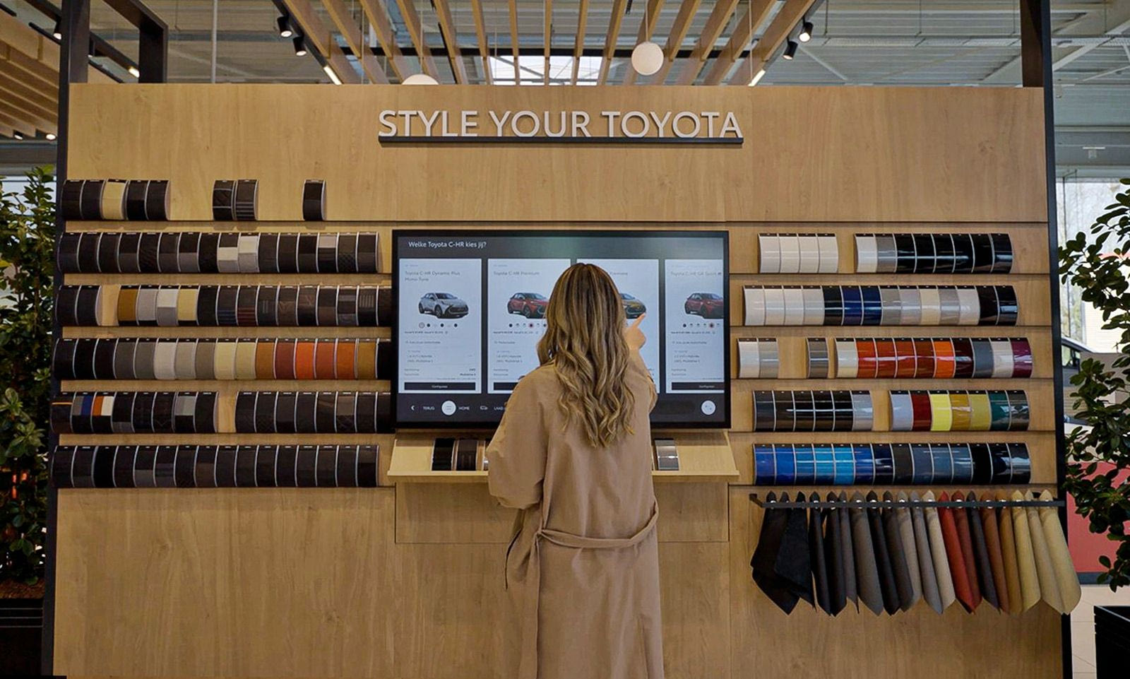 Μια σειρά από οθόνες αφής Samsung και εσωτερικές οθόνες LED είναι εγκαταστημένες σε βασικά ψηφιακά σημεία των αντιπροσωπειών της Toyota, όπως οι ρεσεψιόν, τα γραφεία των συμβούλων πώλησης, οι ζώνες προβολής των οχημάτων και οι χώροι εξυπηρέτησης των πελατών. Οι επισκέπτες των ψηφιακών αντιπροσωπειών της Toyota μπορούν να περιηγηθούν ανάμεσα σε διαφορετικά μοντέλα οχημάτων, να δουν τις προδιαγραφές τους και να εξερευνήσουν τις διαθέσιμες προσφορές απευθείας μέσω των οθονών Samsung Smart Signage.