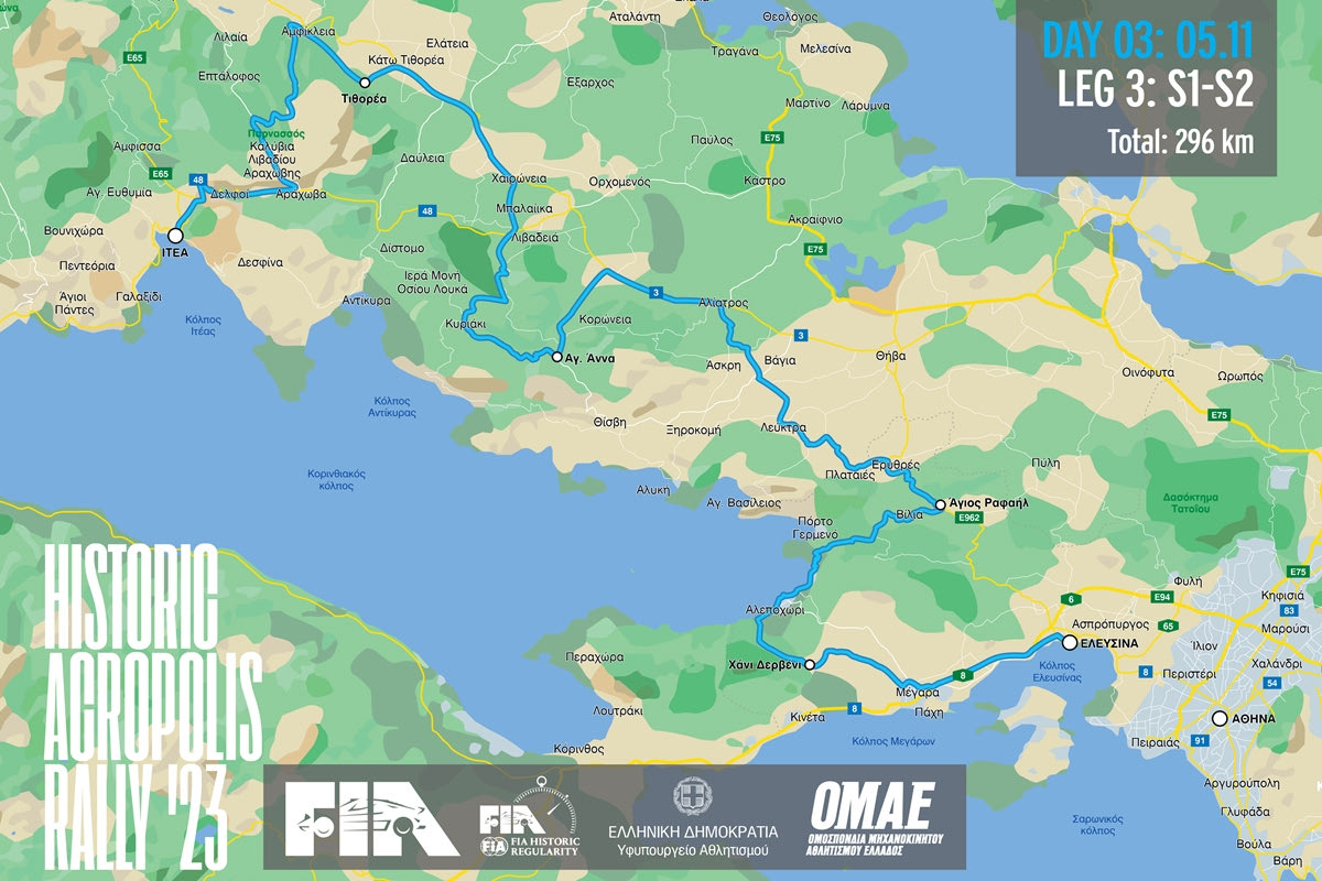 Τα πληρώματα θα περάσουν από Επτάλοφο, Πολύδροσο, Χαιρώνεια, Κυριάκι, Αγία Άννα, Πλαταιές και Ερυθρές, για να φτάσουν στα Βίλια όπου θα γίνει η ανασυγκρότηση. Στο τελευταίο μέρος του αγώνα, η διαδρομή περνάει από Ψάθα, Αλεποχώρι, Χάνι και Μέγαρα, για να τερματίσει στην Ελευσίνα στις 16:00, μετά από 296 χιλιόμετρα.