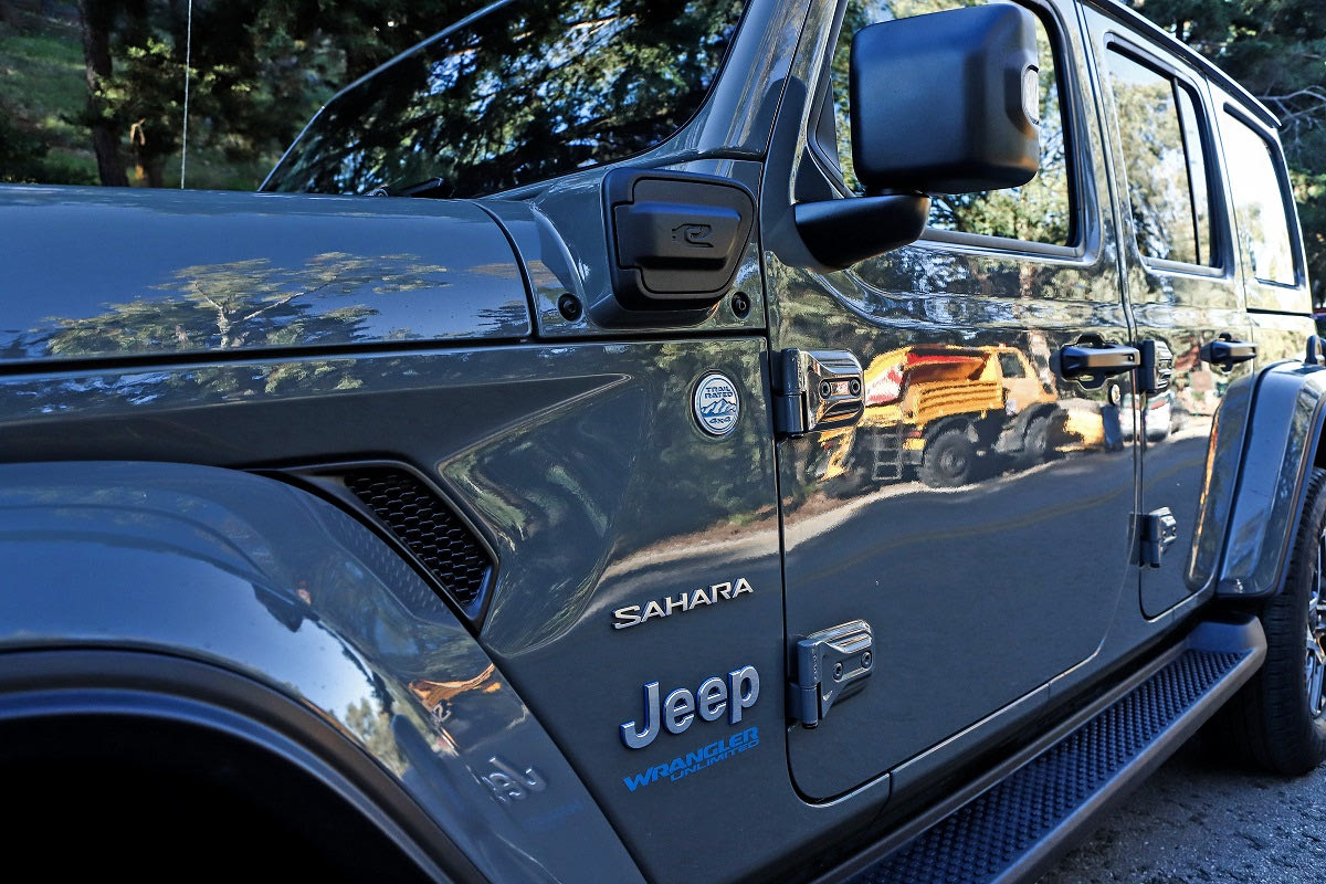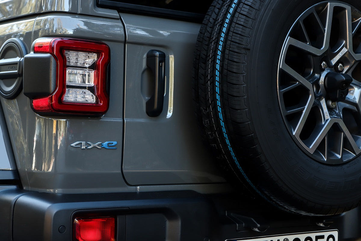 Η διάκριση της υβριδικής έκδοσης από τις θερμικές είναι πολύ λεπτή: γίνεται μόνο με το σήμα 4xe στην πίσω πόρτα, με τη δεύτερη τάπα -μαζί με της βενζίνης- για την υποδοχή της πρίζας φόρτισης, καθώς και με τα μπλε γράμματα με τα οποία είναι γραμμένες οι λέξεις Wrangler Unlimited στα φτερά.