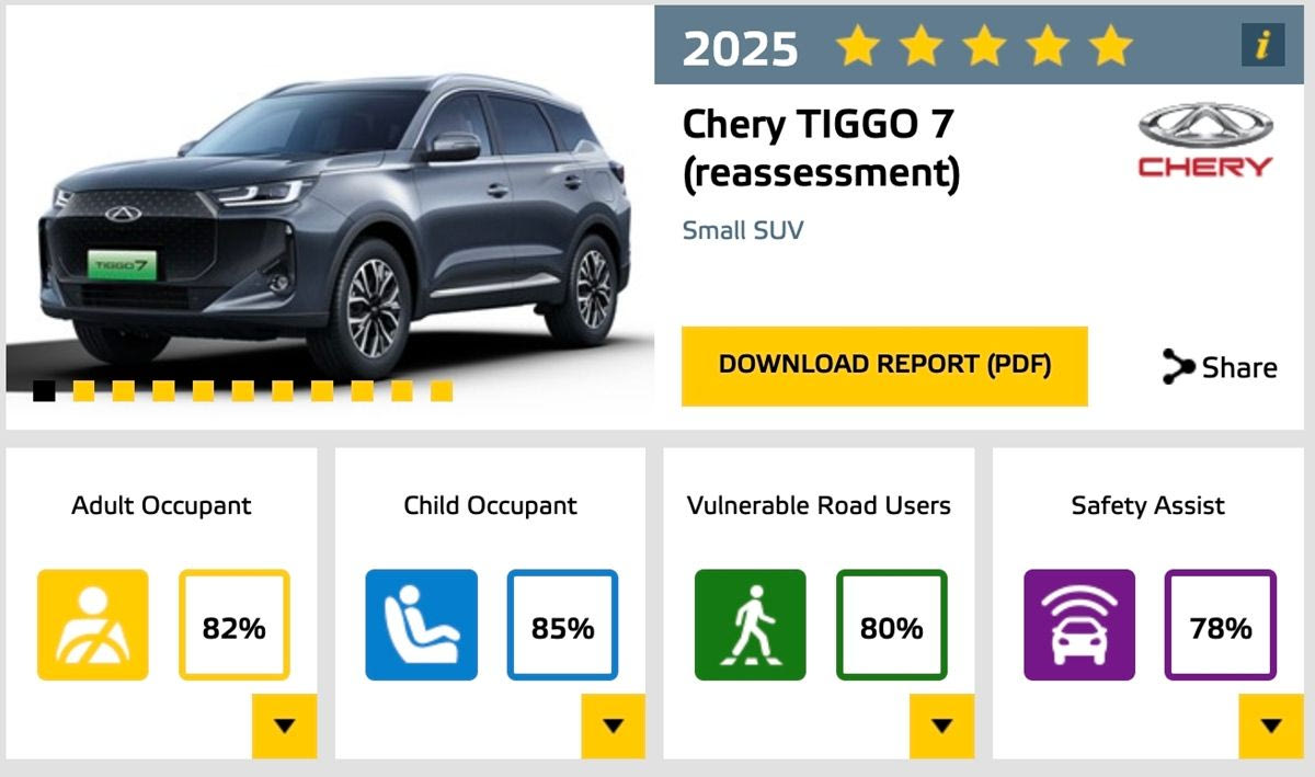 Τόσο το Chery Tiggo 7 CSH όσο και το Chery Tiggo 8 CSH παρουσίασαν εξαιρετικές επιδόσεις, με βαθμολογία 82% στην προστασία ενηλίκων επιβατών, 85% στην προστασία παιδιών, 80% στην προστασία ευάλωτων χρηστών του δρόμου και 78% στα βοηθήματα ασφάλειας. Τα ισορροπημένα αποτελέσματα σε όλες τις κατηγορίες εξασφάλισαν την πολυπόθητη βαθμολογία 5 αστέρων, υπογραμμίζοντας τη δέσμευση της Chery για κορυφαίο επίπεδο ασφάλειας στα μοντέλα της.