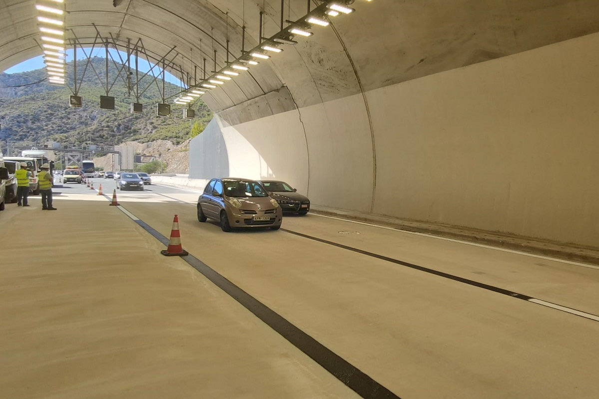 Στη σήραγγα “Θησέας” της Ολυμπίας Οδού, στο ύψος της Κακιάς Σκάλας και στο ρεύμα προς Αθήνα, η άσφαλτος βάφτηκε άσπρη. Δείτε γιατί.