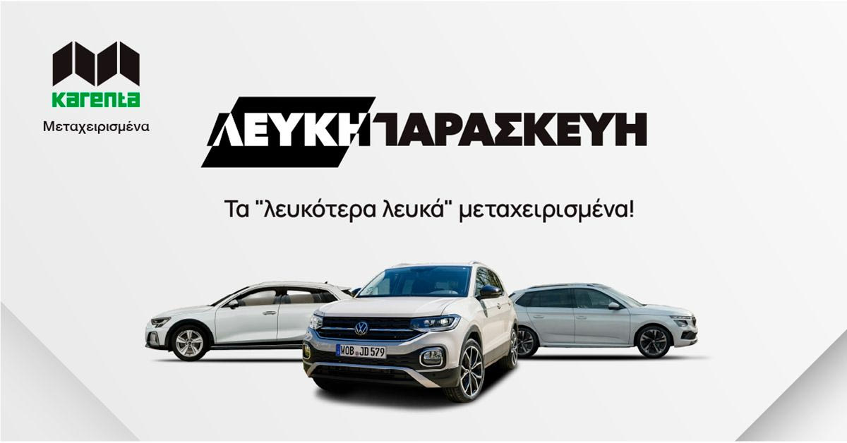 Η Karenta μας καλεί να ξεχάσουμε τη Black Friday. Καθώς φέτος, η Karenta γιορτάζει τη “Λευκή Παρασκευή”, προσφέροντας μοναδικά οφέλη στα μεταχειρισμένα Volkswagen, Audi και Skoda. Μέχρι και τις 29 Νοεμβρίου 2025, οι επισκέπτες των καταστημάτων της Karenta σε όλη την Ελλάδα –καθώς και του karenta.gr– έχουν τη μοναδική ευκαιρία να ανακαλύψουν δεκάδες ευκαιρίες αγοράς με όρους που ξεχωρίζουν: