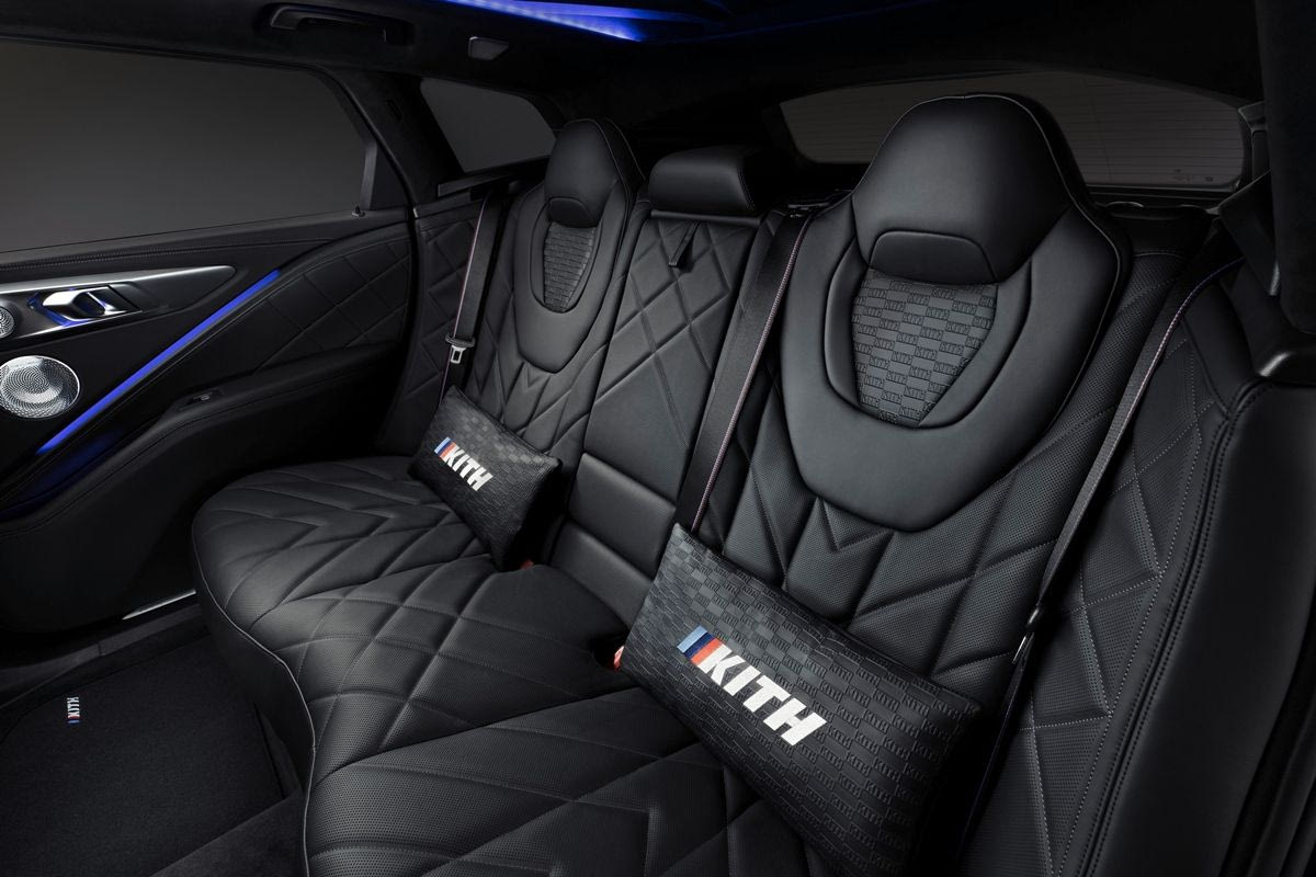 Στο εσωτερικό, το μοντέρνο cockpit σπορ αυτοκινήτου της BMW XM by Kith συμπληρώνεται από αποκλειστικές, λεπτομέρειες που αντικατοπτρίζουν την εντυπωσιακή αισθητική της Kith. Τα φωτιζόμενα μαρσπιέ στις πόρτες φέρουν το ειδικό διακριτικό «1/47», υποδηλώνοντας πόσο σπάνιο είναι κάθε αντίτυπο. Τα βελούδινα πατάκια και το κέντρο ελέγχου στην κεντρική κονσόλα είναι διακοσμημένα με το λογότυπο Kith και τις λωρίδες M.