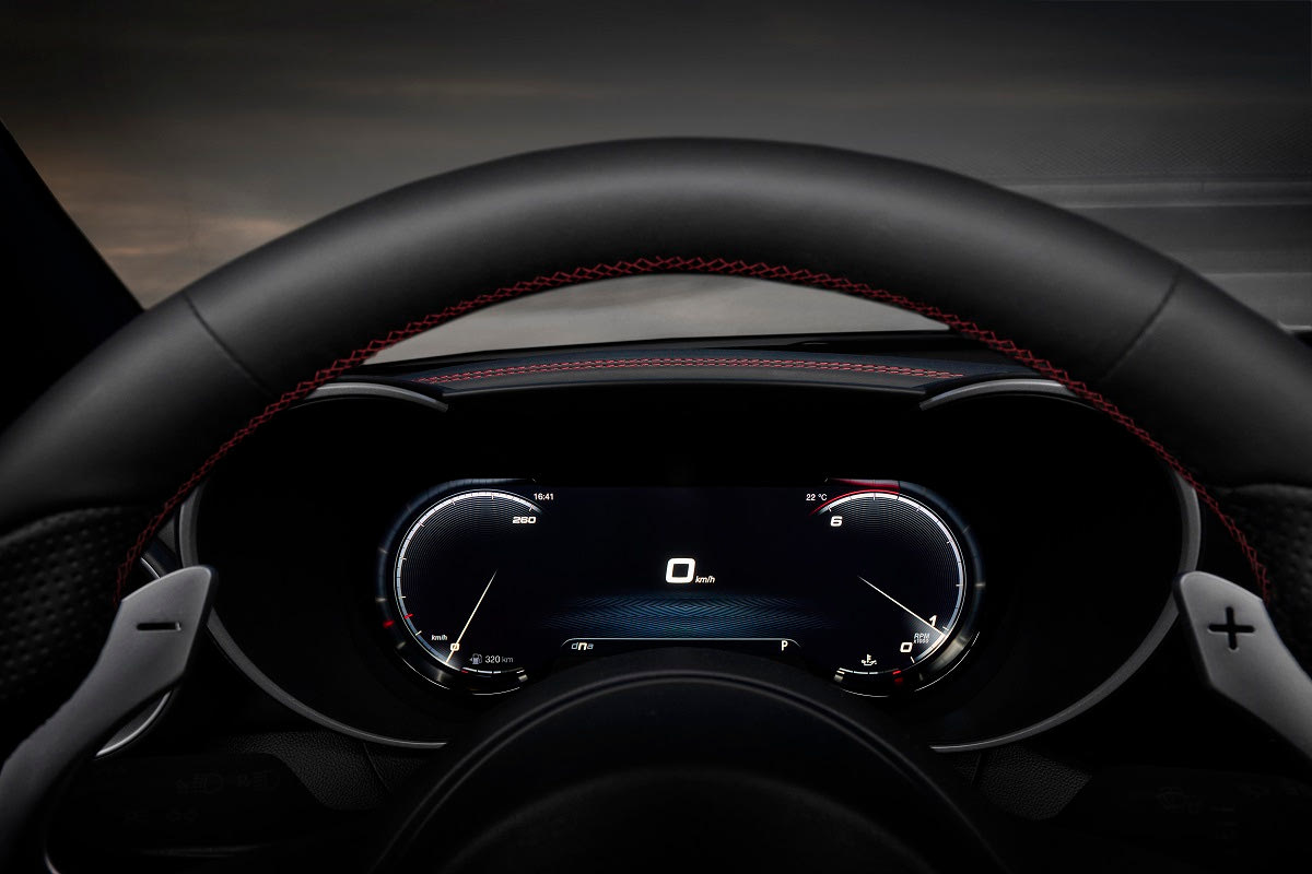 Το νέο “Trilobo”, η σύνθεση δηλαδή της χαρακτηριστικής τριγωνικής μάσκας (“Scudetto”) και των αεραγωγών, προσφέρουν ένα πιο επιθετικό, αλλά πάντα κομψό ρύγχος. Κυρίαρχο σημείο αποτελούν τα νέα “3+3” φωτιστικά σώματα Full-LED Adaptive Matrix, τα οποία παραπέμπουν στην νέα Tonale αλλά και στο θρυλικό παρελθόν της μάρκας, θυμίζοντας μοντέλα όπως η Alfa Romeo SZ Zagato και το πρωτότυπο Alfa Romeo Proteo.
