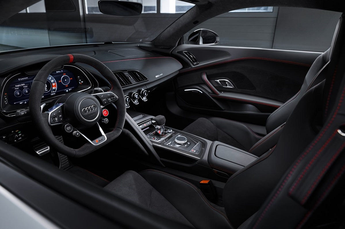 Οι ελαφριοί σφυρήλατοι τροχοί βασίζονται σε αγωνιστικά μοντέλα της Audi, ενώ το κεραμικό σύστημα πέδησης εξοικονομεί επιπλέον βάρος. Παράλληλα, υπάρχουν μπάκετ καθίσματα ειδικά για το R8 και η σπορ ανάρτηση performance με την αντιστρεπτική ράβδο από CFRP.