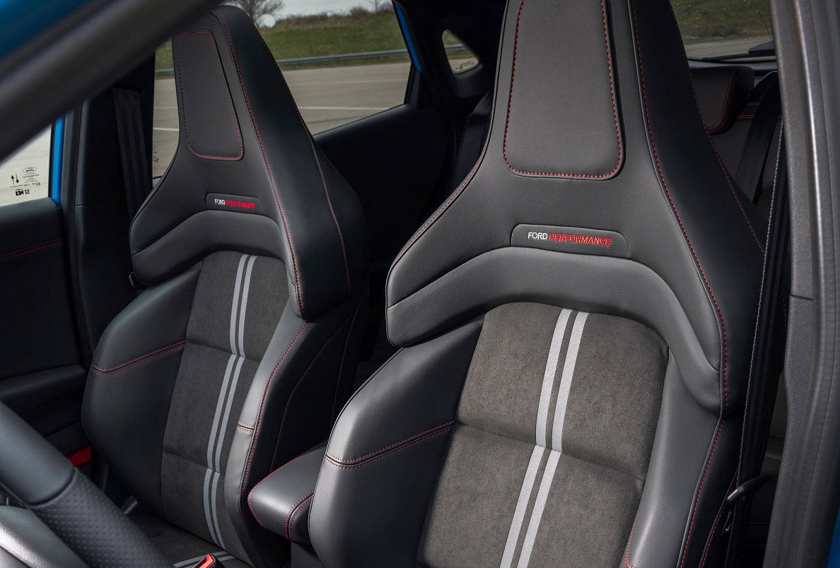 Στο εσωτερικό υπάρχουν σπορ καθίσματα εξελιγμένα από την Ford Performance, επενδεδυμένα με premium συνθετικό υλικό Sensico με δερμάτινη αίσθηση. Ο εξοπλισμός περιλαμβάνει ακόμη βάση ασύρματης φόρτισης, θερμαινόμενο παρμπρίζ Quickclear, εμπρός και πίσω αισθητήρες στάθμευσης, υαλοκαθαριστήρες με αισθητήρα βροχής, μόντεμ FordPass Connect και σύστημα επικοινωνίας και ψυχαγωγίας SYNC 3 της Ford, συμβατό με Apple CarPlay και Android Auto.
