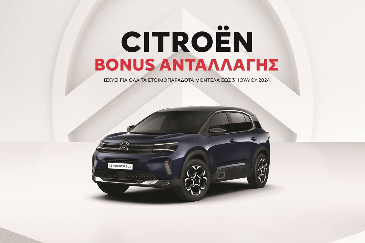 Το Bonus Ανταλλαγής είναι μια πρακτική και ευέλικτη λύση για τους φίλους της γαλλικής μάρκας που επιθυμούν να αντικαταστήσουν το μεταχειρισμένο τους αυτοκίνητο με ένα νέο μοντέλο της Citroen. Στην πράξη, η Citroen προσφέρει σημαντική υπεραξία επιπλέον της εμπορικής αξίας κάθε μεταχειρισμένου αυτοκινήτου οποιασδήποτε μάρκας, κατάστασης και κυβισμού.