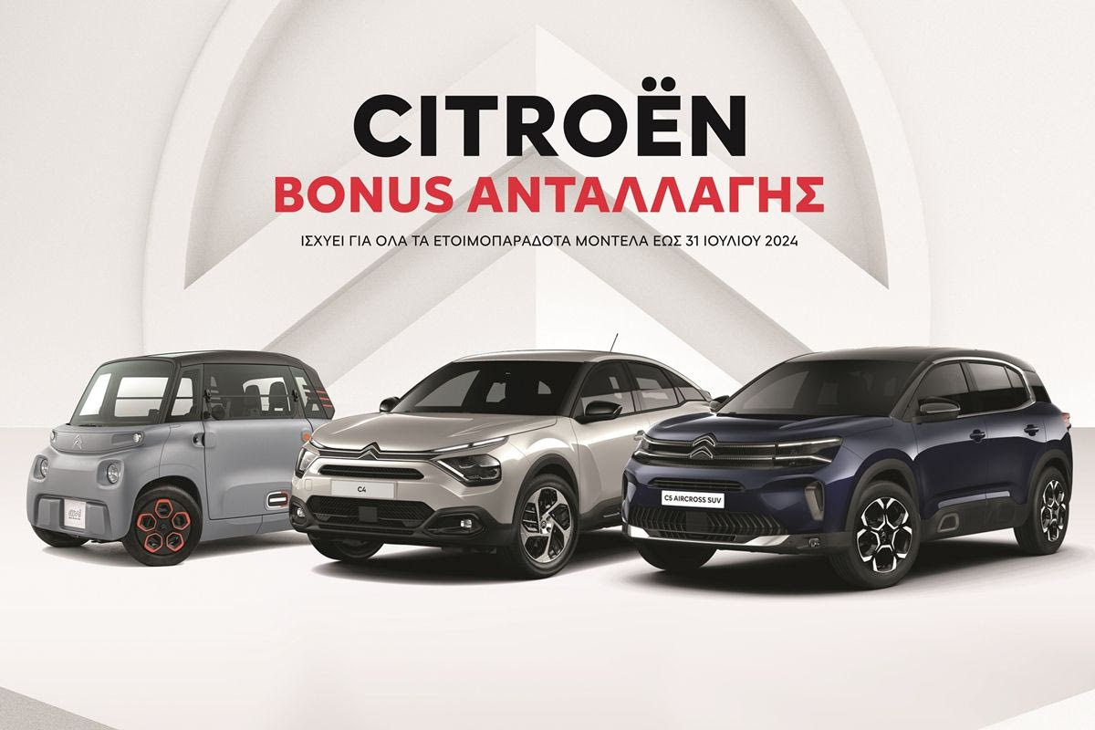Έτσι ο ιδιοκτήτης του μπορεί να αποκτήσει ένα νέο μοντέλο της Citroen εκμεταλλευόμενος με τον καλύτερο τρόπο το παλιό του αυτοκίνητο. Το Bonus Ανταλλαγής ισχύει για όλη την γκάμα των επιβατικών μοντέλων της Citroen, περιλαμβανομένων των δημοφιλών SUV της μάρκας, C3 Aircross & C5 Aircross, το best seller της μάρκας Citroen C3 καθώς και AMI που απαντάει στους περιορισμούς της αστικής μετακίνησης.