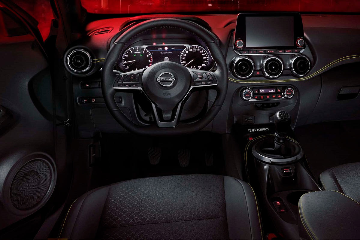 Επιπλέον, το JUKE Kiiro ξεχωρίζει από ένα εκλεπτυσμένο μοτίβο σε μαύρο-γκρι, το οποίο συναντάται στους καθρέφτες και τις άκρες της οροφής. Μια πρόσθετη λεπτομέρεια, τέλος, είναι το φινίρισμα αλουμινίου που έχει τοποθετηθεί στο χείλος του μπροστινού προφυλακτήρα.