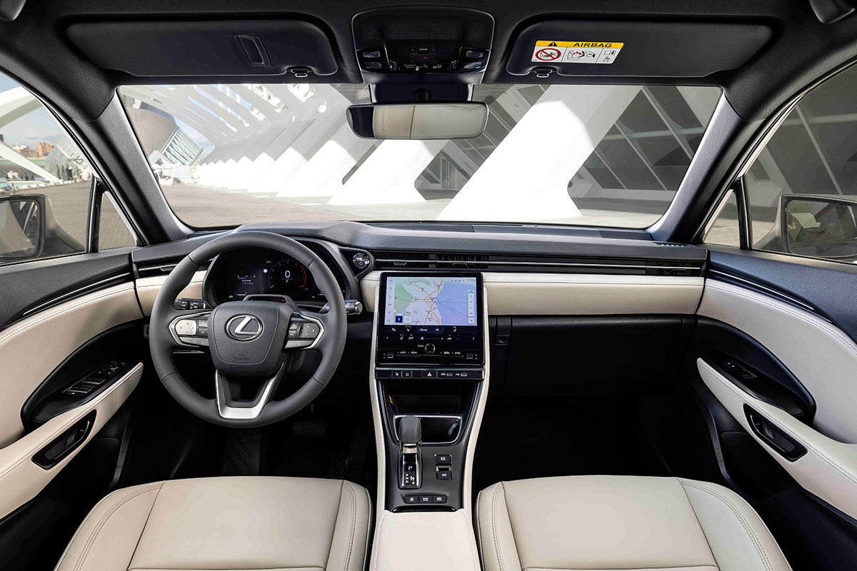 Είναι αρκετά ζεστό σε αίσθηση, με επενδύσεις από συνθετικό δέρμα, μαλακά υλικά στο ταμπλό, χώρο ασύρματης φόρτισης του κινητού και φυσικά με τις δύο ψηφιακές οθόνες. Εκείνη του πίνακα οργάνων έχει διάσταση 12,3 ιντσών και εκείνη των πολυμέσων στο κέντρο του ταμπλό 9,8” με το τελευταίας γενιάς λειτουργικό Lexus Link Connect – και φυσικά πλήρη συνδεσιμότητα μέσω Apple CarPlay και Android Auto και με ενσωματωμένο σύστημα πλοήγησης.