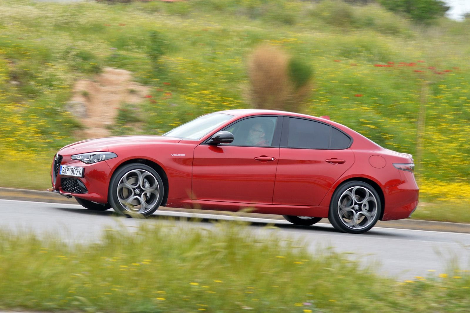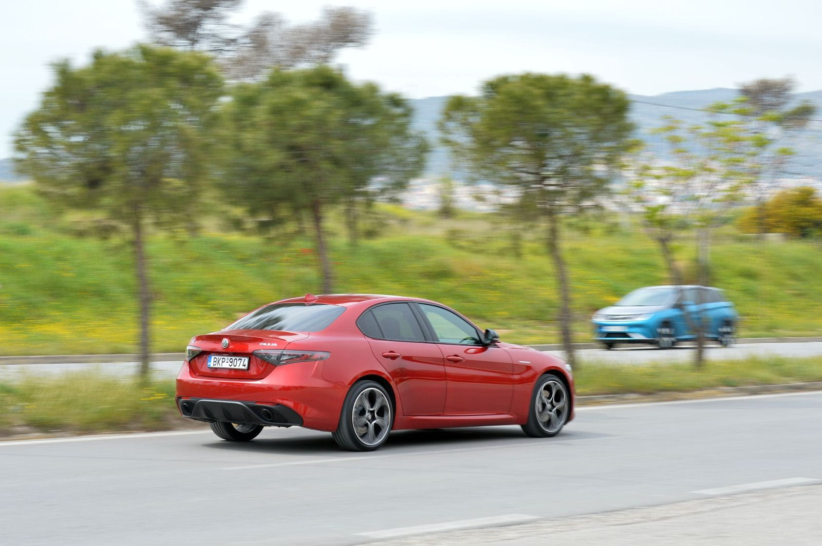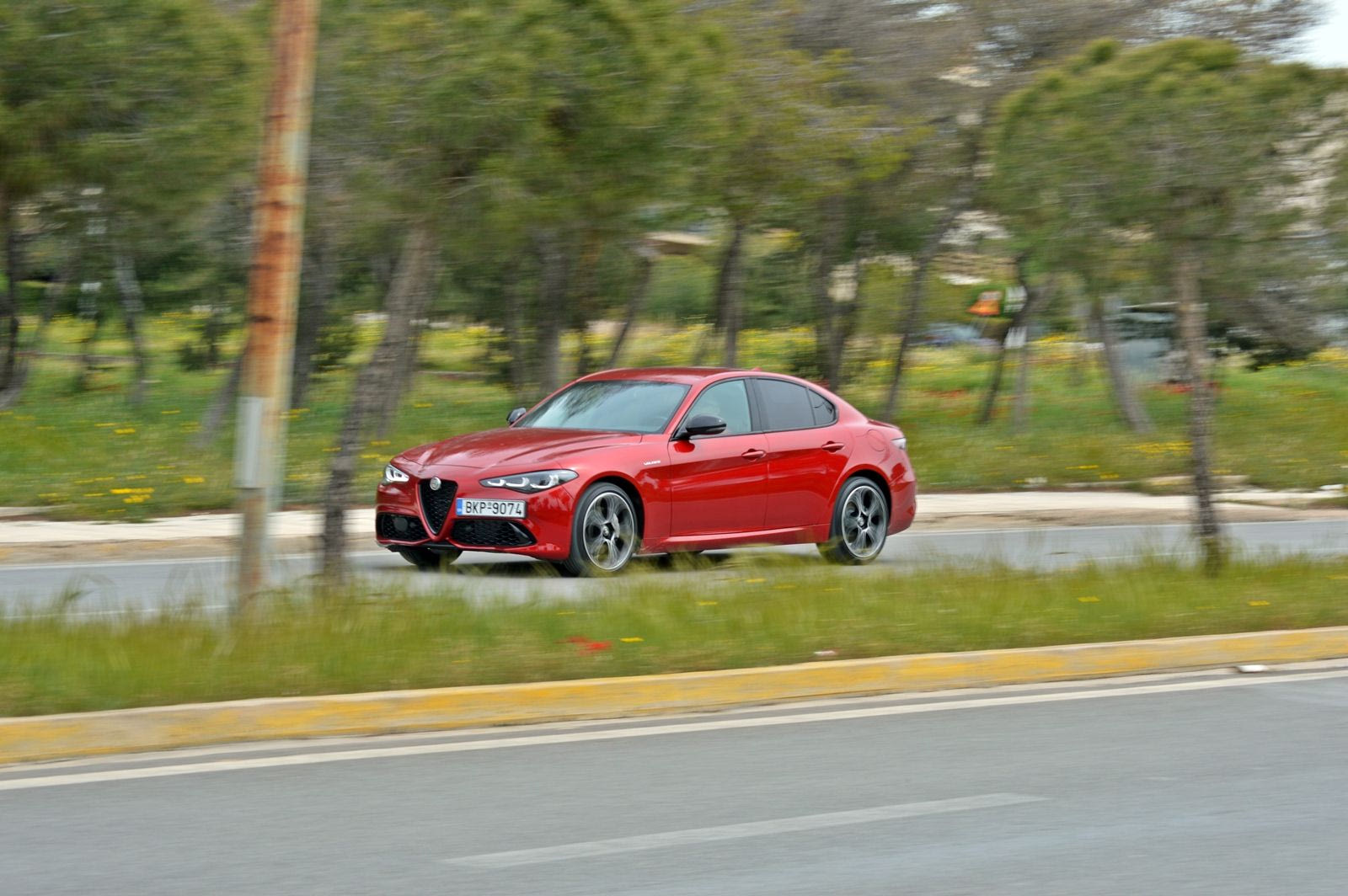Στη χειροκίνητη λειτουργία, η απόλαυση των αλουμινένιων paddles που είναι σταθερά τοποθετημένα πίσω από το τιμόνι και καταλαμβάνουν πάνω από τη μισή περίμετρο του κύκλου προκειμένου να έχεις πρόσβαση ακόμα και με το τιμόνι στριμμένο, είναι πραγματικά μέρος της μυσταγωγίας. Με ελάχιστη δύναμη, τα paddles μεταφέρουν την εντολή από τα ακροδάκτυλα του οδηγού, στα έγκατα του κιβωτίου της ZF και όλα λειτουργούν όπως πρέπει. Λίγο- πολύ όμως, αυτό ισχύει και για τη “βασική” αδερφή της Giulia– εκείνη με τους 210 ίππους. Σε ετούτη εδώ την περίπτωση, τα πράγματα με τους 70 παραπάνω ίππους, εξελίσσονται λίγο πιο κινηματογραφικά.