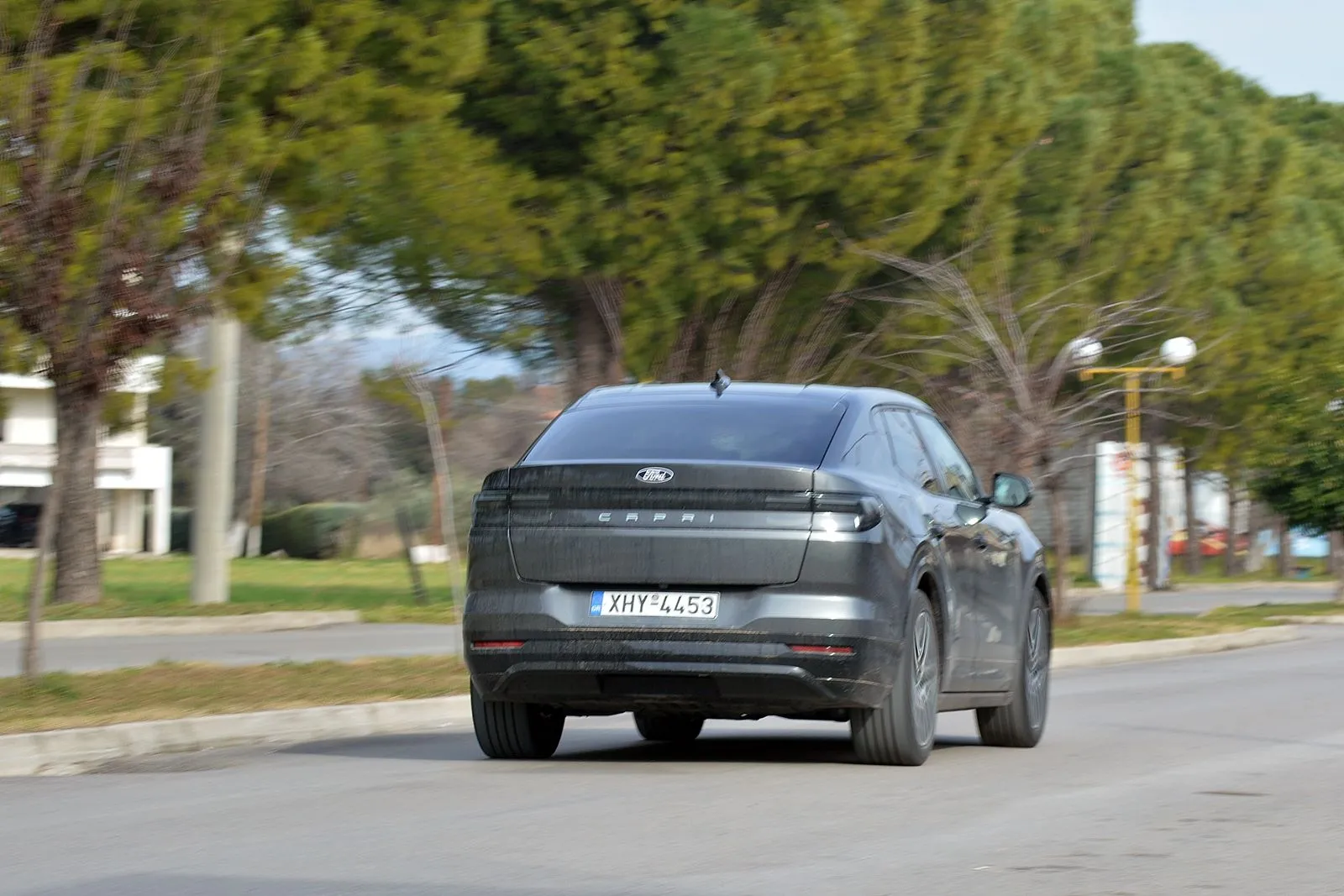 Όπως συμβαίνει με τα περισσότερα ηλεκτρικά, η ροπή είναι άμεσα διαθέσιμη από μηδενικές στροφές, κάτι που μεταφράζεται σε άμεση επιτάχυνση, ακαριαία μόλις πατήσει το γκάζι ο οδηγός. Η Ford ανακοινώνει 0-100 χλμ./ώρα σε 6,4 δευτερόλεπτα, επίδοση που μέχρι πριν λίγα χρόνια ανήκε σε καθαρόαιμα hot hatch (και δη, τετρακίνητα) ή ακόμα και σε σπορ κουπέ. Αυτό σημαίνει ότι παρότι το Capri είναι SUV και ζυγίζει πάνω από δύο τόνους (2.129 κιλά), ο οδηγός δεν θα το αισθανθεί ποτέ αργό ή βαρύ στο δρόμο.