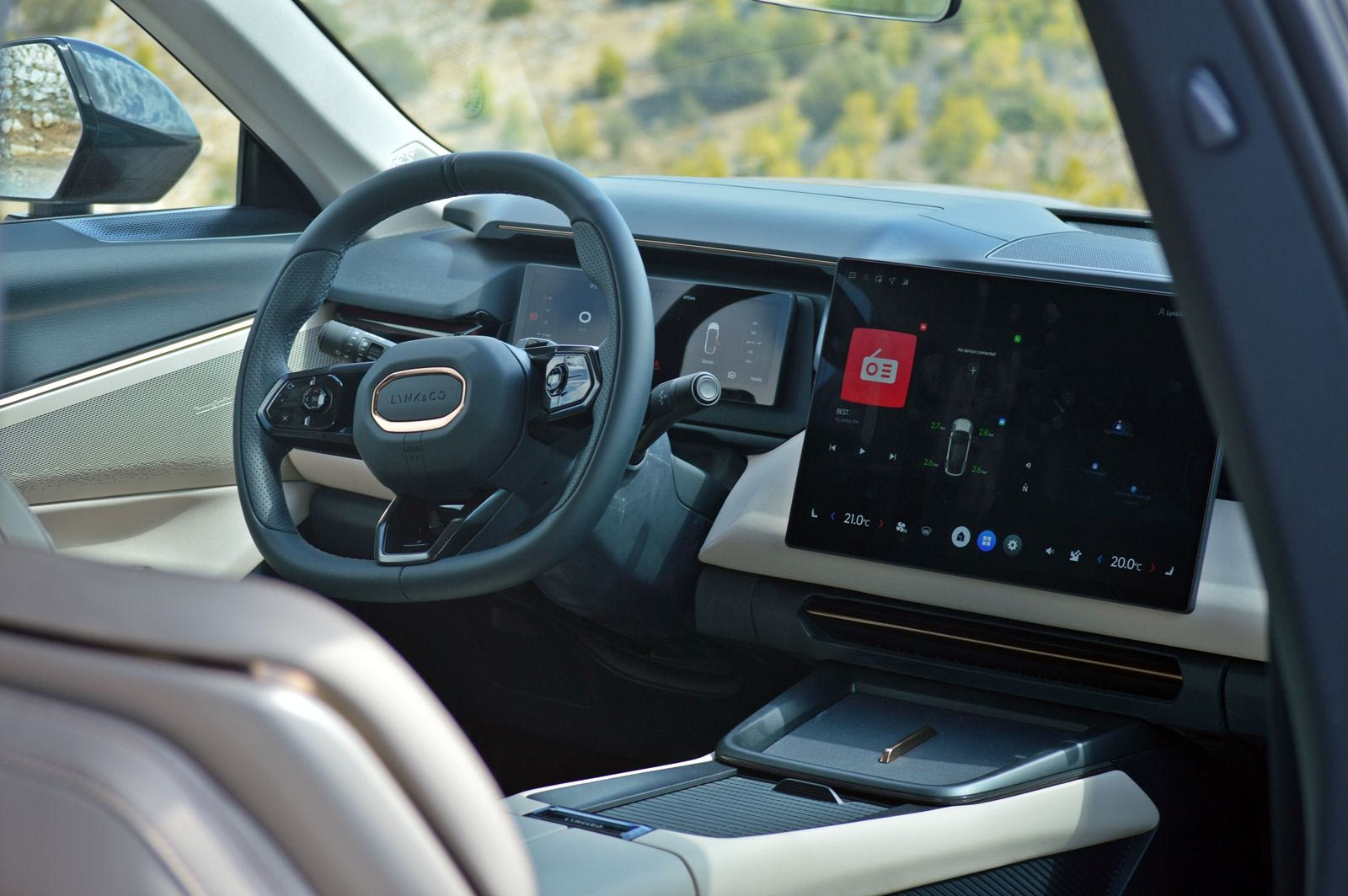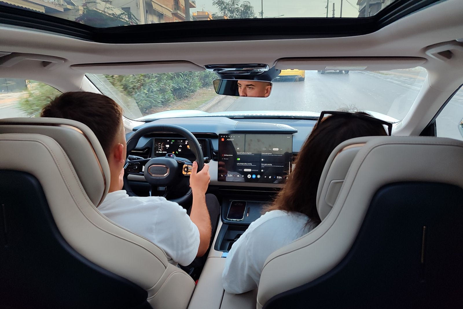 Και εδώ, είναι προφανές πως “ξετινάζουν” την premium διάθεση. Το σύνολο είναι αφοπλιστικά premium και μόνο στο σημείο που ασχολείσαι με την τιμή αγοράς του, δεν το δείχνει. Άντε και στην “κρατημένης ποιότητας” -για να το πω κομψά- εταζέρα στο χώρο αποσκευών. Κάθομαι πίσω από το (περίεργο) τιμόνι και χαζεύω κάμποσο την αισθητική που αναπόφευκτα “κλείνει το μάτι” στα πρότυπα της Volvo αλλά και κολακεύει όποιον βρεθεί στην καμπίνα του. Κεντρική οθόνη σαν iPad Pro, υλικά μαλακά και προσεγμένα, αισθητική καθαρή με μια υποψία Σκανδιναβίας- είπαμε…