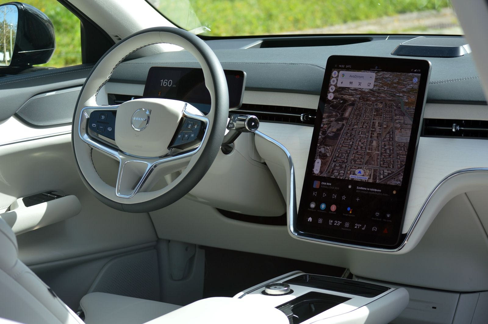 Το σύστημα infotainment λειτουργεί με το νέο Google Automotive OS, και παρά την πληθώρα επιλογών, η αλληλεπίδραση είναι τόσο ομαλή και φυσική, που νιώθεις πως το αυτοκίνητο καταλαβαίνει ακριβώς τι θες. Η σύνδεση με το smartphone γίνεται χωρίς κόπο, ενώ οι φωνητικές εντολές είναι εξαιρετικά ακριβείς, κάτι που αναδεικνύει τη δύναμη της τεχνολογίας της Volvo. Η καμπίνα του EX90 είναι επίσης εξαιρετικά ευρύχωρη, κάτι που το καθιστά ιδανικό για μακρινά ταξίδια, καθώς και για την καθημερινή μετακίνηση.