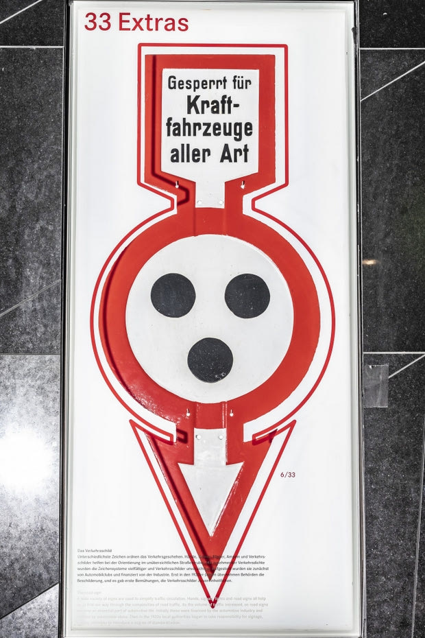 4 – Πόλη και χώρα: στις αρχές του 20ού αιώνα υπήρχαν διάφορα συστήματα για οδικές πινακίδες στη Γερμανία και ήταν κυρίως οι μεγαλύτερες πόλεις που προσπάθησαν από τις πρώτες μέρες να τις κάνουν ομοιόμορφες. Ένα τυπικό χαρακτηριστικό της δεκαετίας του 1920 ήταν οι “σημάνσεις της πόλης”, μια από τις οποίες υπάρχει στο Μουσείο Mercedes-Benz: αυτές οι πινακίδες αποτελούσαν έναν συνδυασμό κυκλικού κεντρικού τμήματος με βέλος. Αν δείχνετε προς τα πλάγια, το βέλος υποδεικνύει την κατεύθυνση της διαδρομής και προς τα πάνω ήταν ένα προειδοποιητικό σημάδι. Τα σημάδια διακοπής κυκλοφορίας ή “περιορισμένης πρόσβασης” είχαν ένα βέλος που να δείχνει προς τα κάτω.