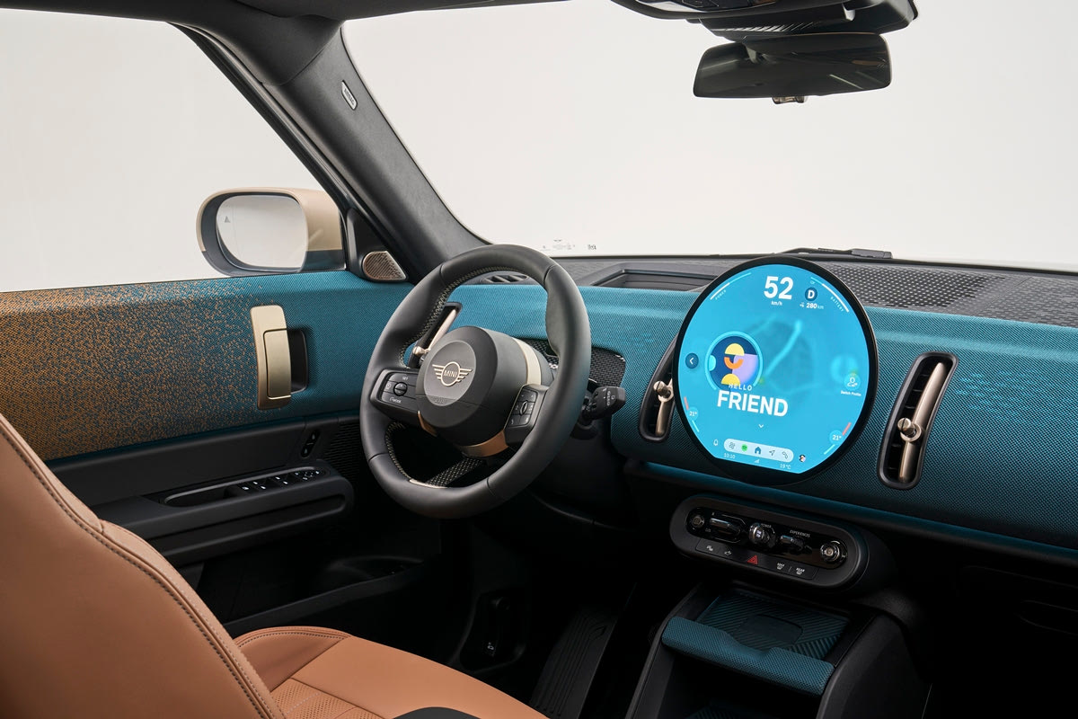 Όπως στο νέο MINI Cooper, το μεγάλο σε μέγεθος κυρτό ταμπλό στις εκδόσεις Classic, Favoured και JCW υιοθετεί για πρώτη φορά υφασμάτινες επιφάνειες. Τα ζεστά και ευχάριστα υλικά συνθέτουν ένα νέο και οικείο περιβάλλον για το MINI Countryman με έμφαση στον παράγοντα ευεξίας. Μια ειδική τεχνική πλέξης χρησιμοποιείται για τη δημιουργία της πρακτικής και ευέλικτης δομής του δίχρωμου υφάσματος από ανακυκλωμένο πολυεστέρα.
