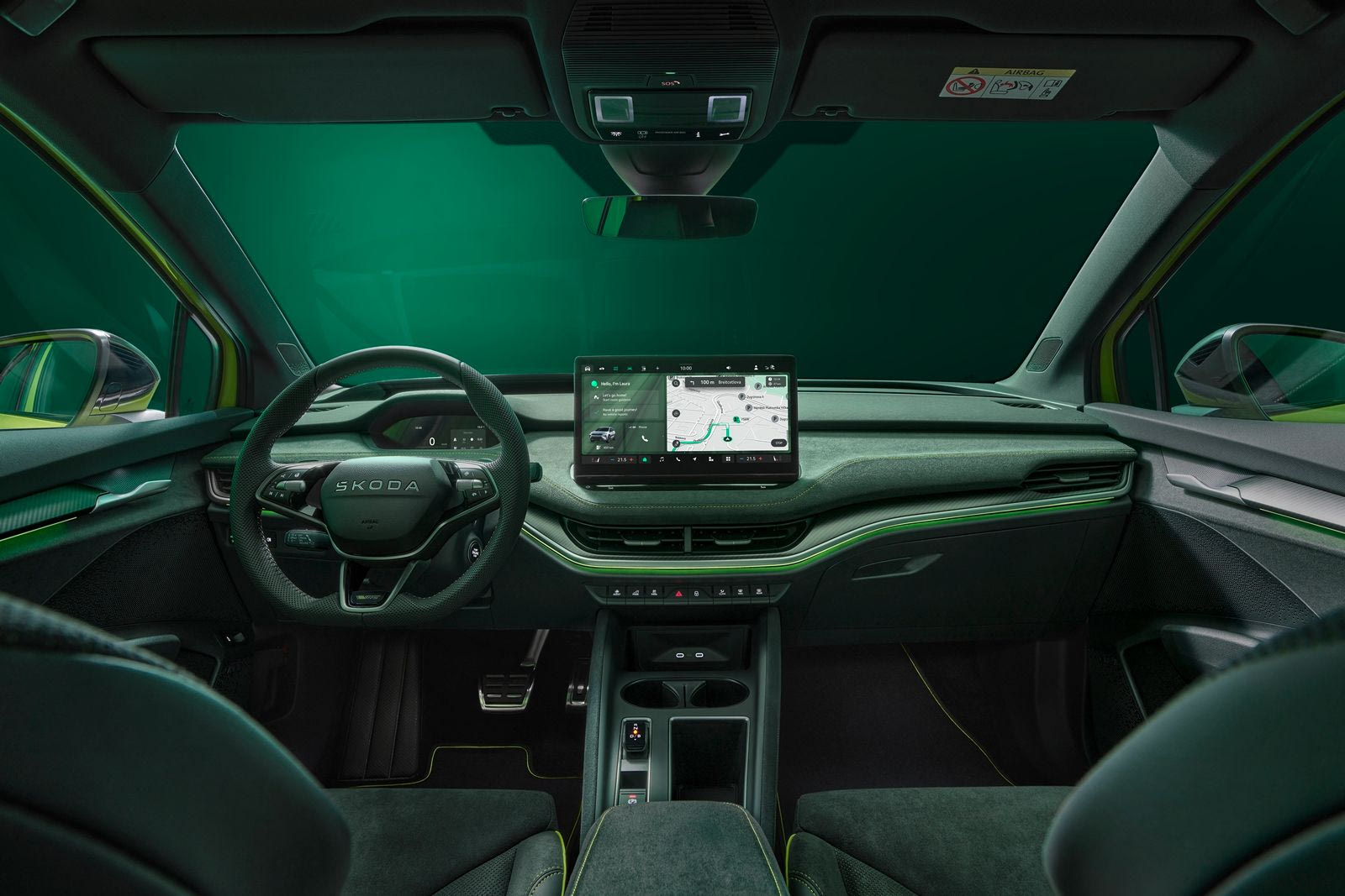 Όλα περιλαμβάνουν γραφικά ειδικά για το RS. Το κουμπί heaters στην οθόνη του infotainment ενεργοποιεί ή απενεργοποιεί έως και τέσσερις λειτουργίες θέρμανσης ταυτόχρονα. Το Skoda Elroq RS διαθέτει στον βασικό εξοπλισμό τέσσερις θύρες USB-C γρήγορης φόρτισης με ισχύ έως και 45 W. Επιπλέον, το Phone Box με ασύρματη φόρτιση και αερισμό προσφέρει ισχύ φόρτισης έως και 15 W. Το ηχοσύστημα CANTON με 12 ηχεία, προαιρετικά διαθέσιμο ως μέρος του πακέτου Advanced, αποδίδει συνολική ισχύ 675 W. Η στάνταρ ηλεκτρική πέμπτη πόρτα με εικονικό πεντάλ “Virtual Pedal” παρέχει εύκολη και άνετη πρόσβαση στο χώρο αποσκευών, χωρητικότητας 470 έως 1.580 λίτρων.