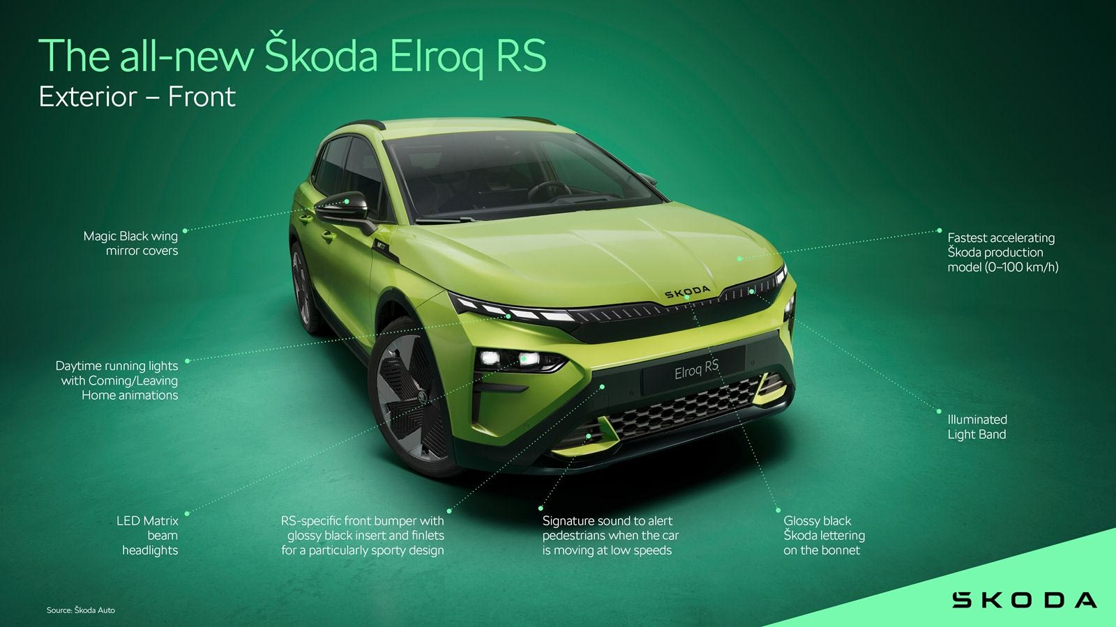 Σε συνεργασία με τον Τσέχο κατασκευαστή υποδημάτων Botas, θα παρουσιαστούν συλλογές παπουτσιών περιορισμένης έκδοσης, εμπνευσμένες από το σχέδιο και τα υλικά του Skoda Elroq. Στο Skoda Elroq RS, οι ηλεκτροκινητήρες – στον μπροστινό και στον πίσω άξονα – αποδίδουν συνολική ισχύ 340 ίππων και προσφέρουν τετρακίνηση. Το αυτοκίνητο επιταχύνει από στάση έως τα 100 χλμ./ώρα σε μόλις 5,4 δευτερόλεπτα, όντας το ταχύτερο σε επιτάχυνση μοντέλο παραγωγής της Skoda μέχρι σήμερα. Η τελική του ταχύτητα είναι ηλεκτρονικά περιορισμένη στα 180 χλμ./ώρα.