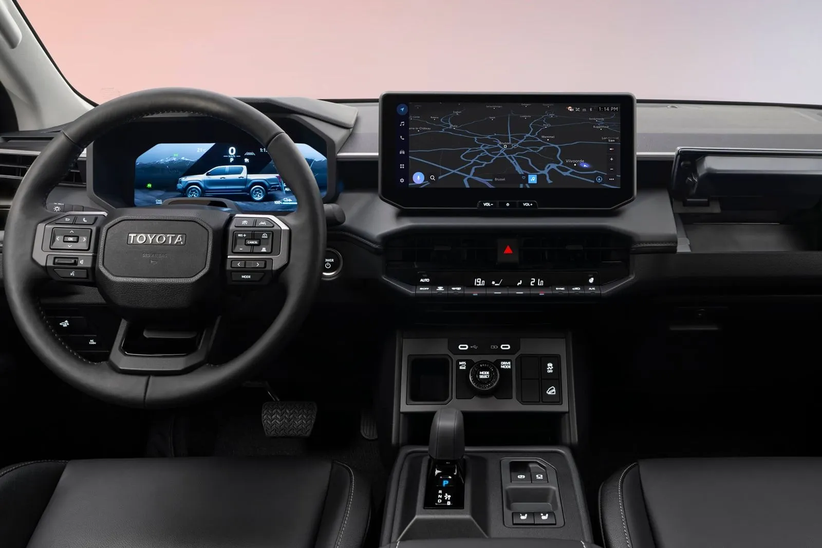 Η κεντρική κονσόλα υιοθετεί νέο οριζόντιο σχεδιασμό, ενσωματώνοντας έναν προσαρμόσιμο πίνακα οργάνων 12,3 ιντσών για τον οδηγό και μια κεντρική οθόνη αφής πολυμέσων, έως 12,3 ιντσών. Όλα τα χειριστήρια τετρακίνησης (AWD) και off-road είναι συγκεντρωμένα σε κεντρική θέση για μεγαλύτερη ευκολία στη χρήση. Το αμιγώς ηλεκτρικό μοντέλο εφοδιάζεται με επιλογέα shift-by-wire, που λειτουργεί με ένα μόνο άγγιγμα. Για την εξασφάλιση της συνδεσιμότητας, το Hilux διαθέτει ασύρματο φορτιστή smartphone και νέες θύρες USB στο πίσω μέρος της καμπίνας