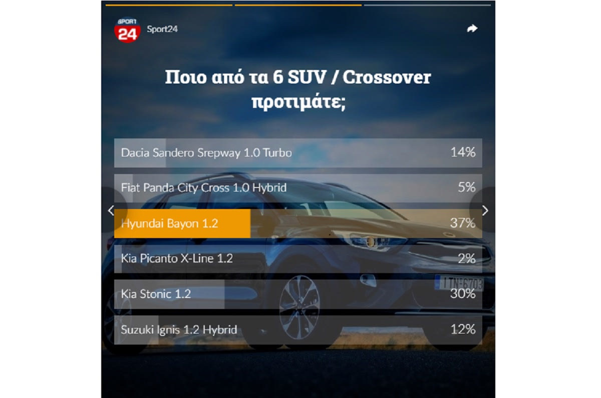Όπως θα δείτε παρακάτω, οι περισσότεροι επιλέξατε το Hyundai Bayon με ποσοστό 37%, με το Kia Stonic να τερματίζει δεύτερο με ποσοστό 30%.