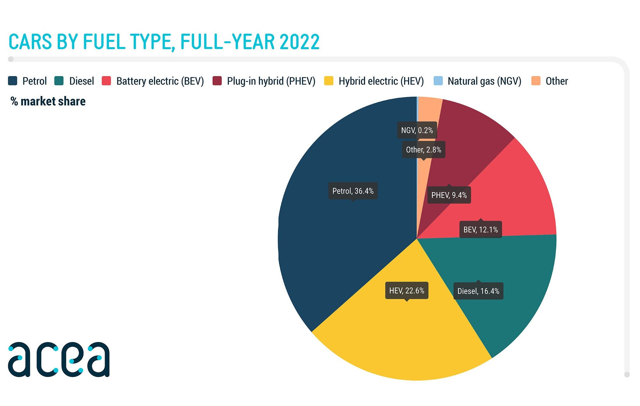 Πωλήσεις Αυτοκινήτων στην ΕΕ το 2022 βάσει τύπου καυσίμου ACEA