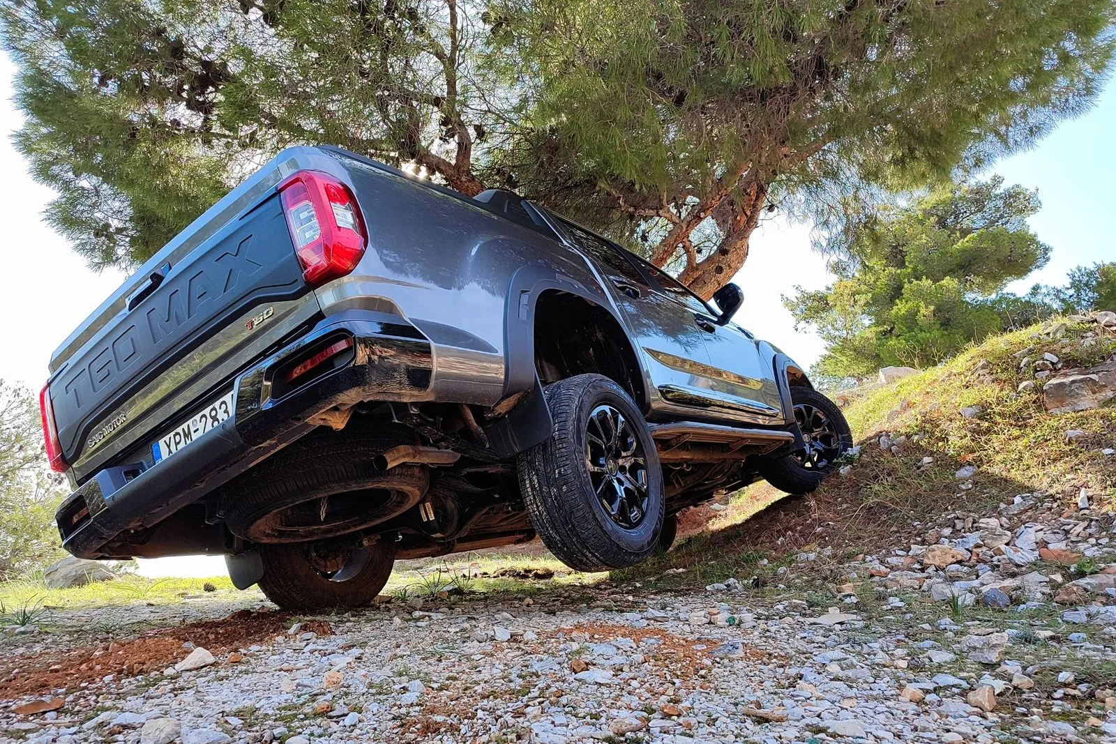 Ο πίσω εσωτερικός τροχός είναι πάνω από 30 εκατοστά στον αέρα στη στιγμή που “κάθισε” η ανάρτηση και κατέβηκα, το αμάξωμα θα πρέπει να στρεβλώσει αλλά προς έκπληξή μου, η πόρτα του οδηγού ανοίγει (και κλείνει) χωρίς διαμαρτυρία, σαν να είναι το αυτοκίνητο παρκαρισμένο σε επίπεδο σημείο της διαδρομής. Αυτό είναι μια πρώτης τάξης ένδειξη για την αυξημένη ακαμψία του pick up της Maxus, που παρά τη “σκάλα” που λέγαμε νωρίτερα, κάθε άλλο παρά “τσίχλα” είναι σε ότι αφορά τις εγκάρσιες στρεβλώσεις.