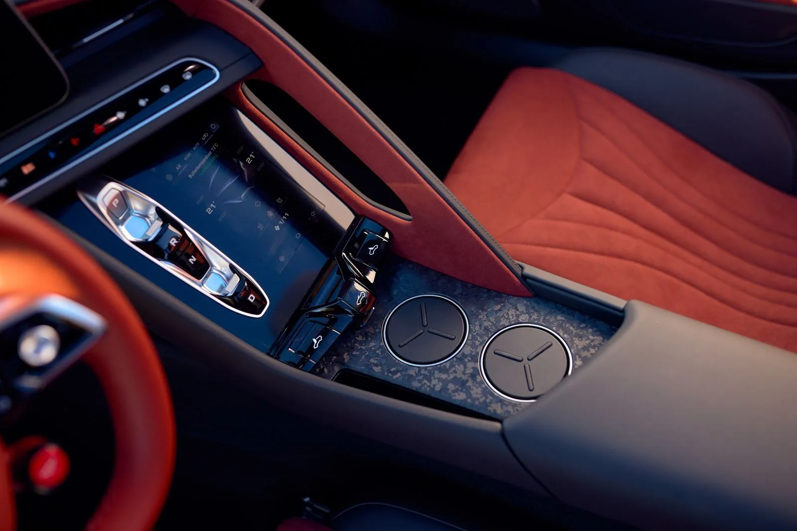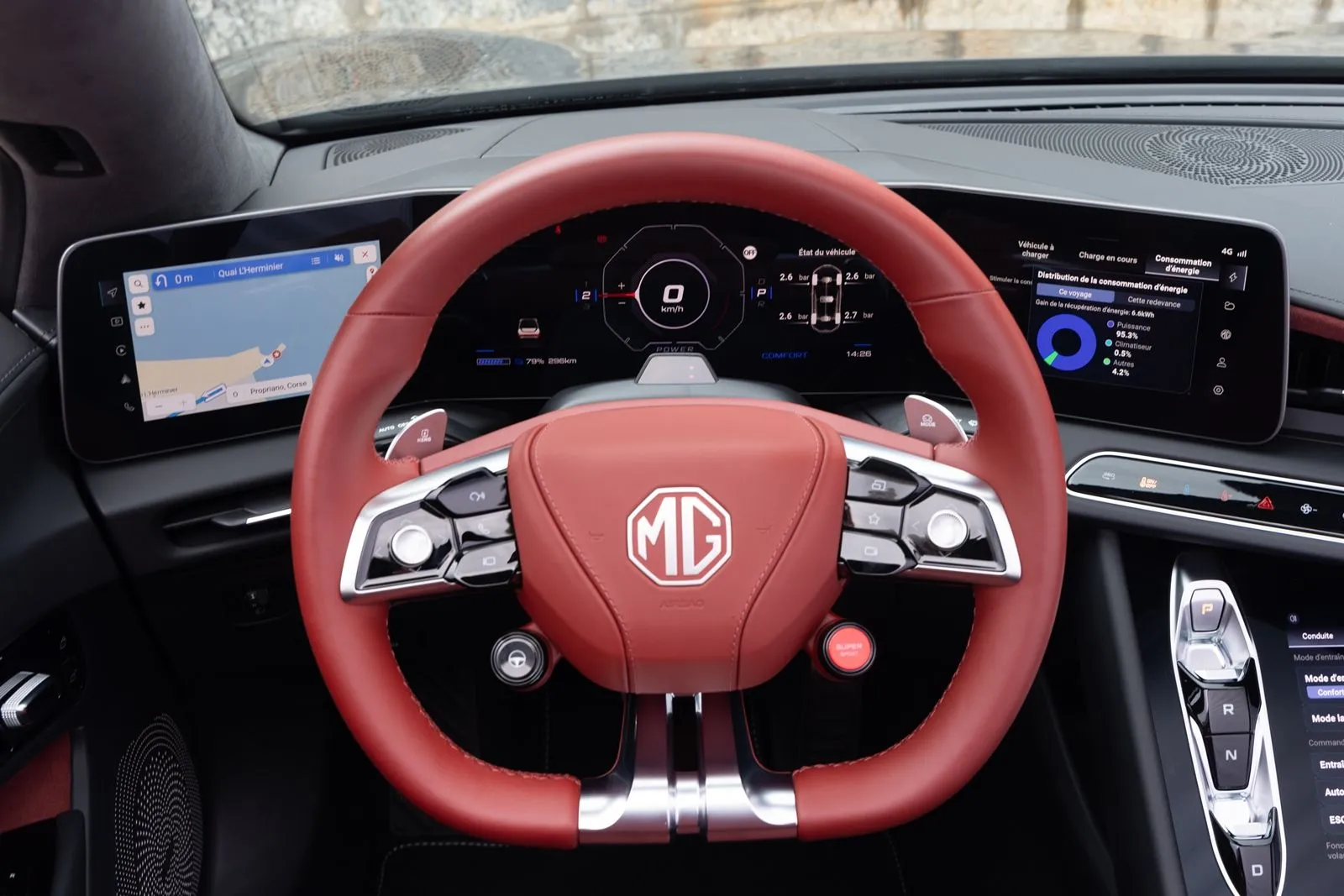 Τα φρένα έχουν δύσκολο έργο λόγω μάζας, αλλά στέκονται στο ύψος των περιστάσεων. Αντέχουν, έχουν σωστή αίσθηση και δεν δείχνουν σημάδια κόπωσης εκεί που θα περίμενες. Και αυτό λέει πολλά για τη συνολική δουλειά που έχει γίνει στο set-up. Αν οδηγικά το Cyberster είναι ειλικρινές, στο εσωτερικό είναι… φιλόδοξο. Το cockpit μοιάζει σχεδιασμένο πρώτα για να σε εντυπωσιάσει και μετά για να σε εξυπηρετήσει. Τρεις οθόνες μπροστά από τον οδηγό, μία ακόμη στο κέντρο και πληροφορία παντού.