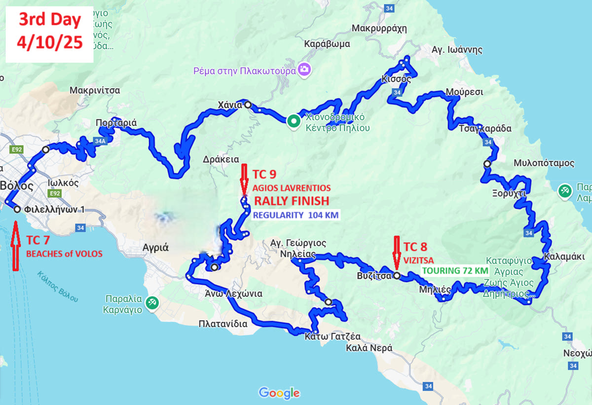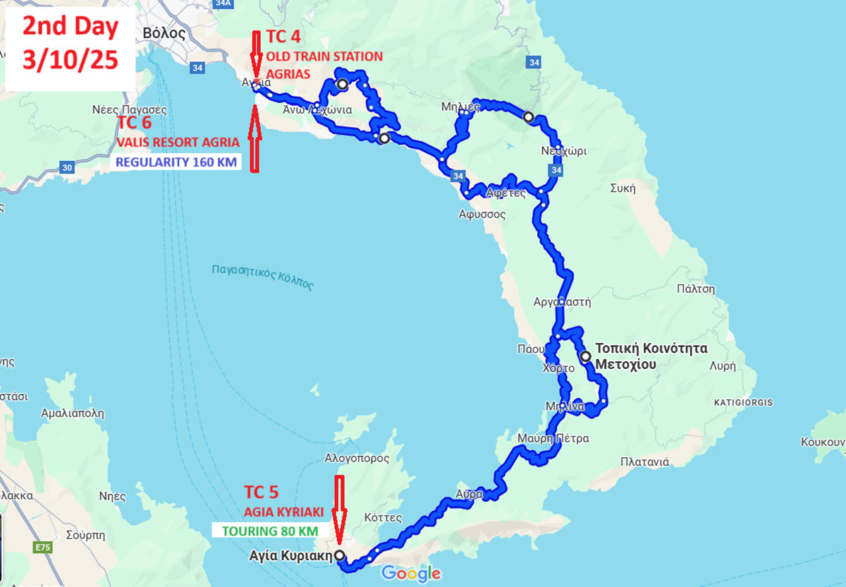 Η εκκίνηση δόθηκε στις 12.30’ στα Καμένα Βούρλα και στη συνέχεια τα πληρώματα και των δύο κατηγοριών πέρασαν από, Θερμοπύλες, Πελασγία, Πτελεό, Νήες για να καταλήξουν στην Αμαλιάπολη που αποτελεί το τερματισμό της πρώτης μέρας για τους συμμετέχοντες της κατηγορίας Touring. Το ίδιο σημείο αποτελεί ωστόσο και το χώρο ανασυγκρότησης για τα πληρώματα της κατηγορίας Classic Regularity, τα οποία στη συνέχεια θα κινηθούν σε εκπληκτικές διαδρομές στους πρόποδες του όρους Όθρυς και δια μέσου Αλμυρού και Βόλου τερμάτισαν στο ξενοδοχείο Valis Hotel Resort στην Αγριά Βόλου, στο οποίο και θα καταλύσουν τα πληρώματα και των δύο κατηγοριών.