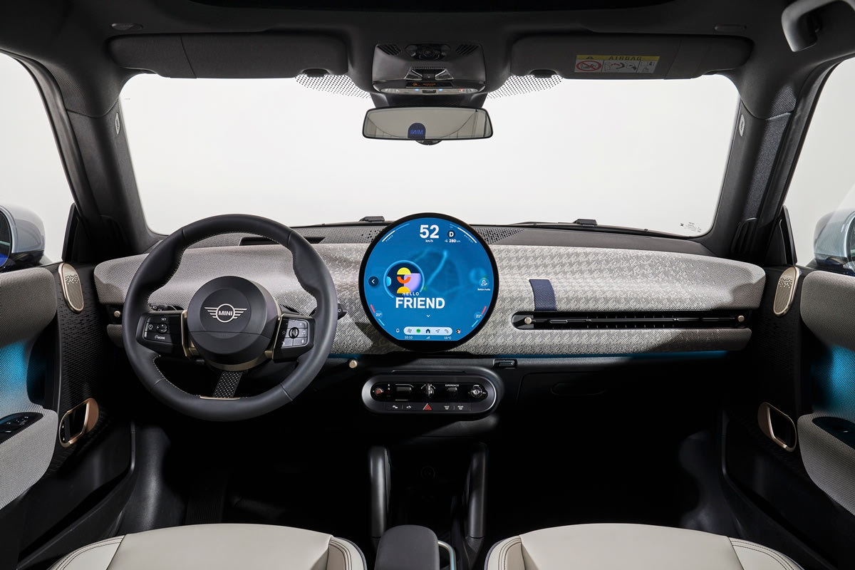 Εκεί, τον πρώτο λόγο έχουν ένα λεπτό και “γενναιόδωρο” ταμπλό και ένα τιμόνι πολλαπλών λειτουργιών που εγγυάται με τη σειρά του την γνωστή αίσθηση go-kart MINI. Η κεντρική οθόνη OLED, με την ονομασία MINI Interaction Unit, θέτει νέα πρότυπα με την υψηλή της ανάλυση και καθιστά πιο έντονη την παρουσία του στρογγυλού οργάνου, το οποίο έχει διάμετρο 240 χιλιοστά.