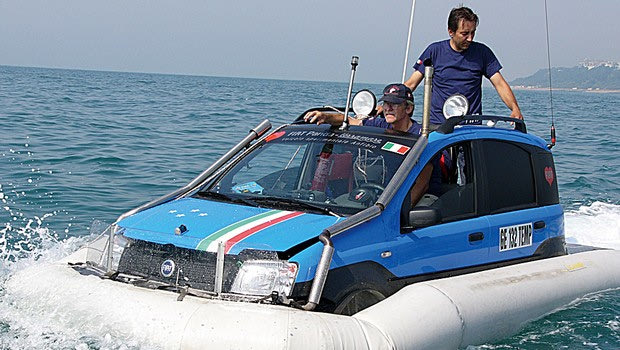Ακόμα ένα αμφίβιο Panda, βασισμένο πάλι στο πλαίσιο της έκδοσης 4×4, αυτή τη φορά όμως εφοδιασμένο με μια λαστιχένια «ζώνη» με αέρα γύρω από το αμάξωμα και ένα κινητήρας waterjet που επέτρεψαν σε αυτό το «αδιάβροχο» Panda να διασχίσει το κανάλι της Μάγχης σε μόλις 6 ώρες.