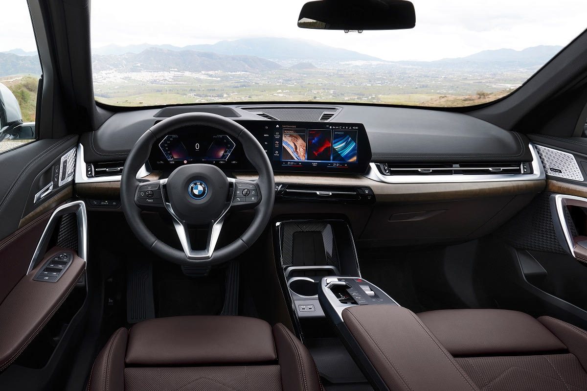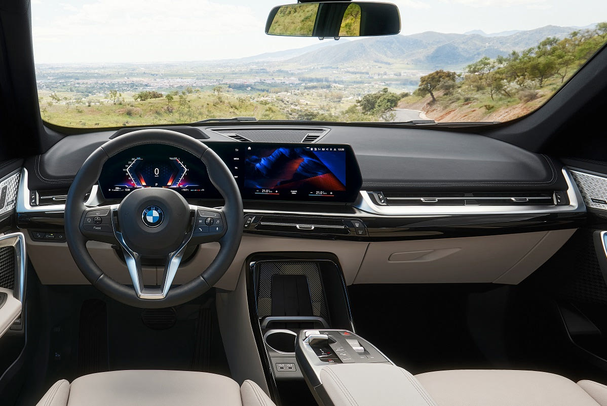Η υπερυψωμένη θέση των καθισμάτων, το BMW Curved Display με τις οθόνες του ψηφιακού πίνακα οργάνων και του infotainment, το “αιωρούμενο” υποβραχιόνιο με ενσωματωμένο πάνελ ελέγχου και η θέση για το smartphone με έμμεσο φωτισμό στο εμπρός μέρος της κεντρικής κονσόλας είναι τα στοιχεία που κυριαρχούν στην καμπίνα της νέας BMW X1.