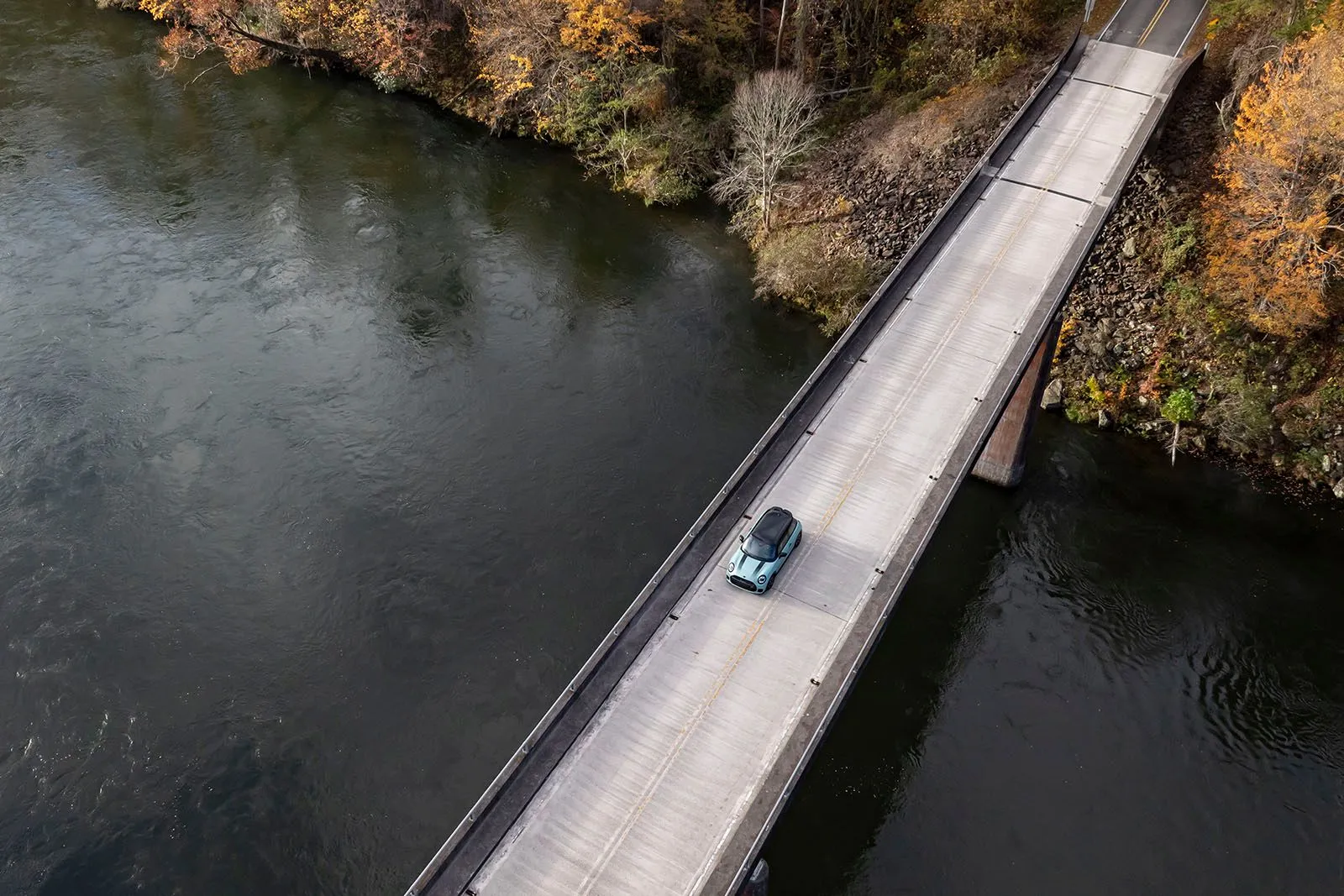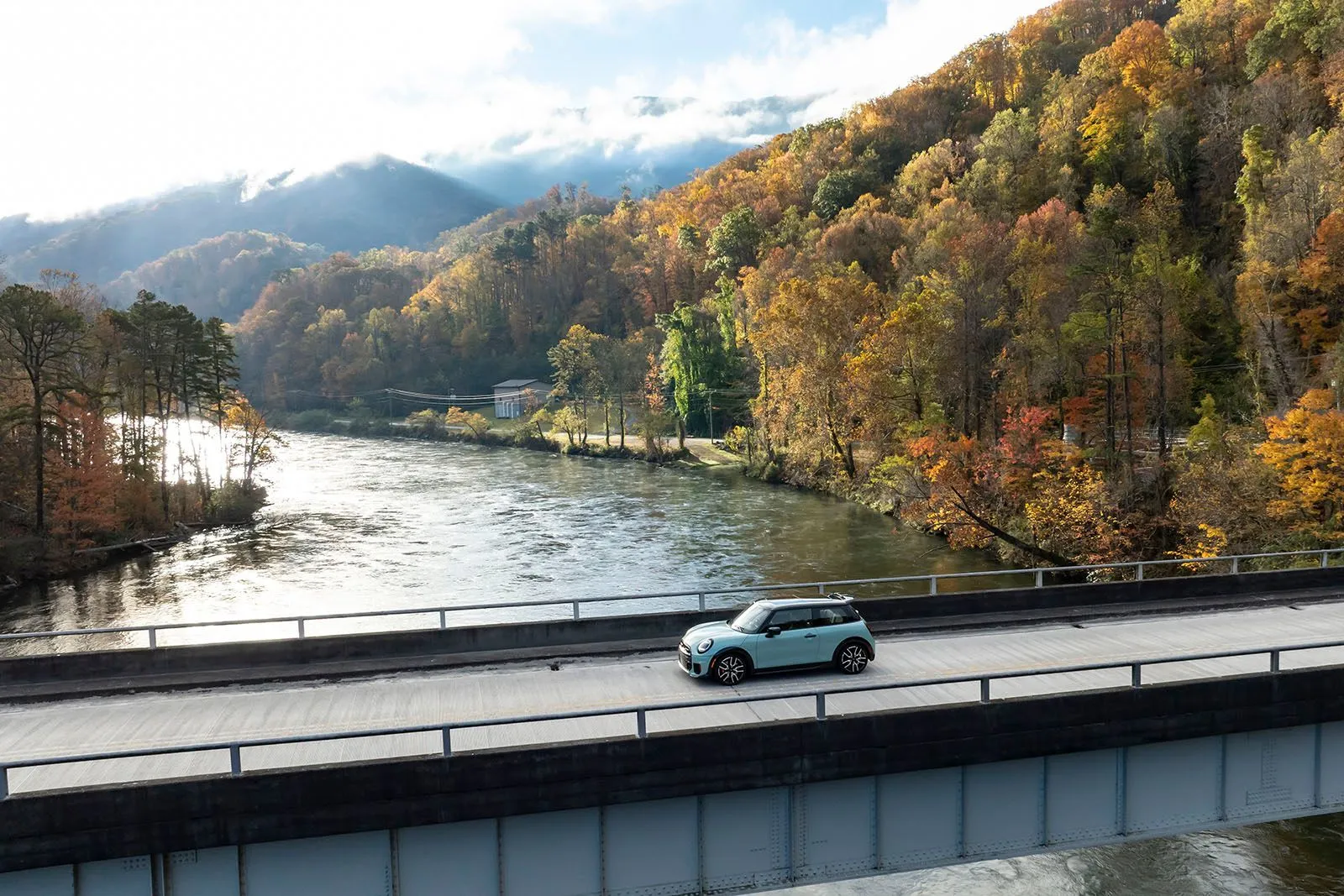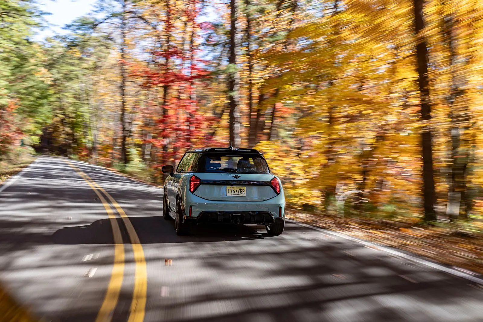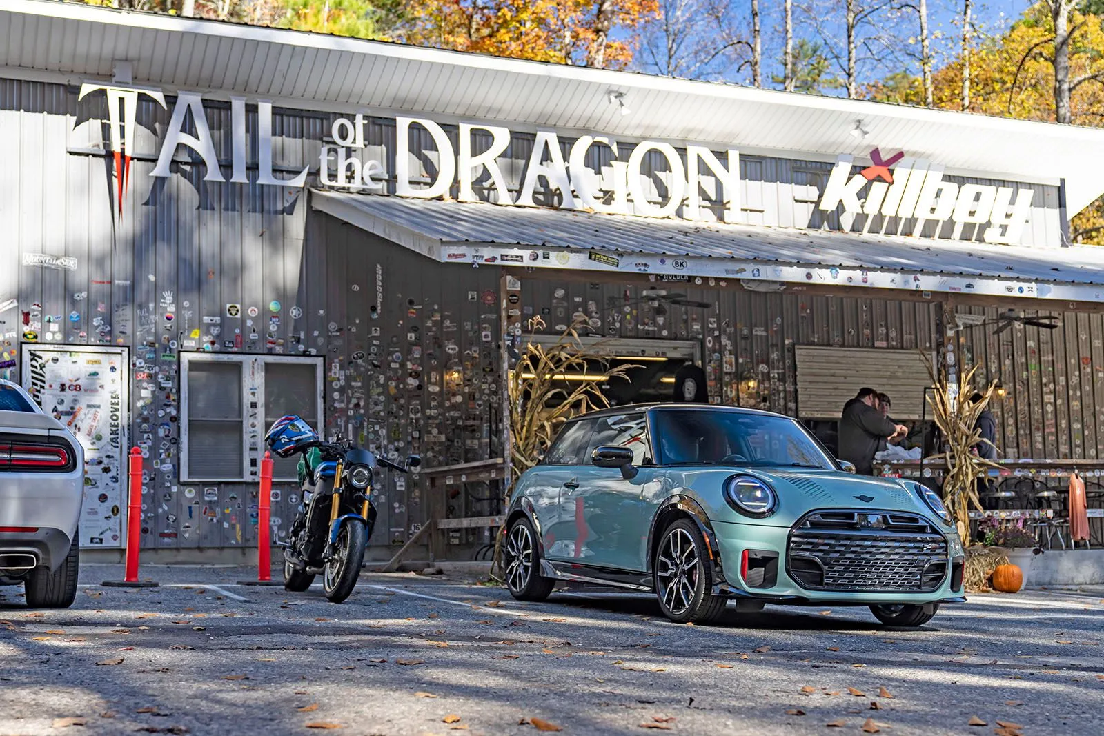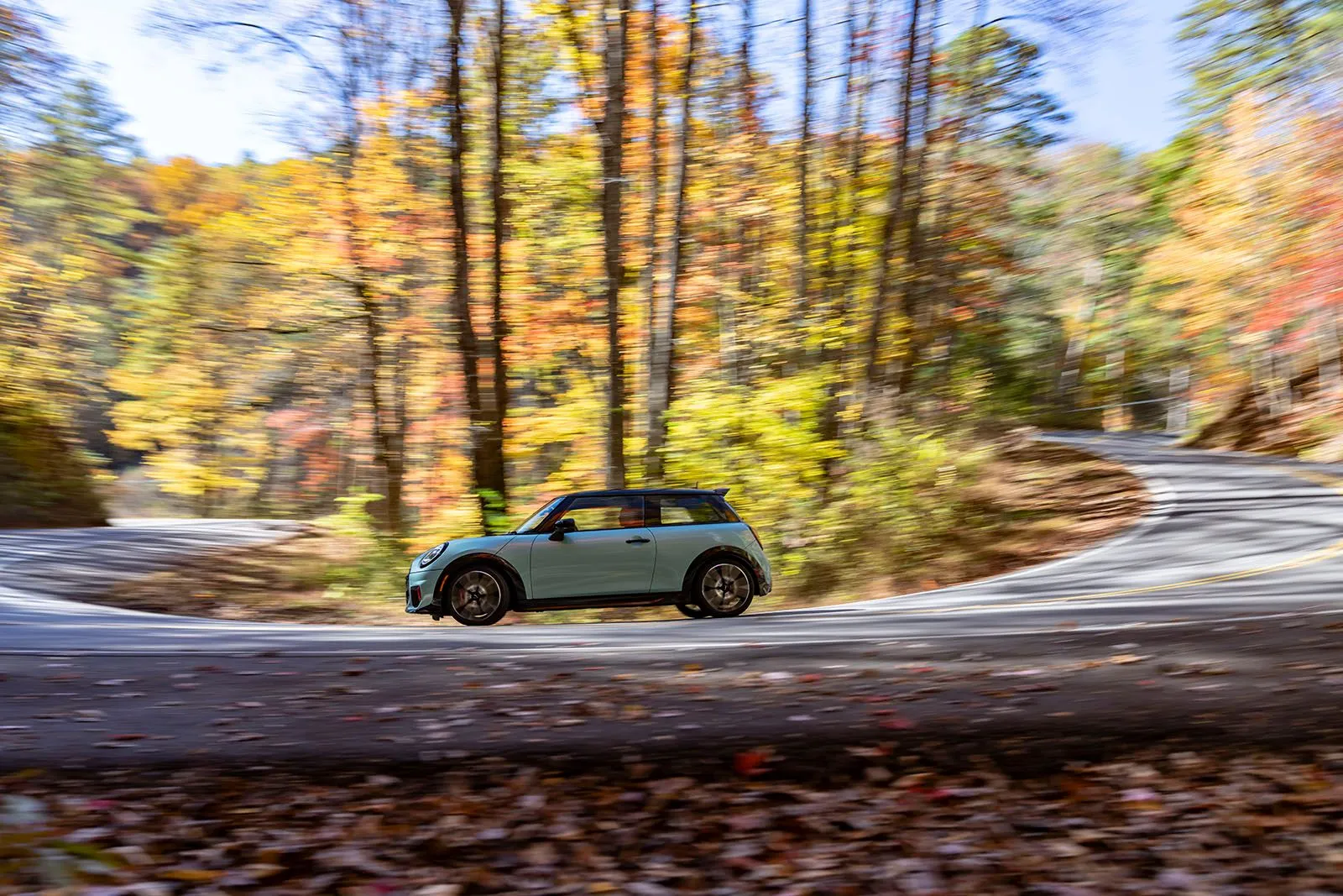 Asheville. Ο ήλιος λάμπει, και οι φυλλωσιές αστράφτουν σε αποχρώσεις κίτρινου, κόκκινου και πορτοκαλί. Στο επίκεντρο αυτού του τοπίου βρίσκεται ένα Mini John Cooper Works σε απόχρωση Ocean Wave Green. Ένα εντυπωσιακό σκηνικό, χαρακτηριστικό των Great Smoky Mountains -στα σύνορα Β. Καρολίνας και Τενεσί- με φόντο τη λεγόμενη “Ουρά του Δράκου”, την πιο επικίνδυνη διαδρομή των ΗΠΑ: μήκους 17,7 χιλιομέτρων με 318 στροφές. Κάθε στροφή αποτελεί πρόκληση για οδηγό και αυτοκίνητο.