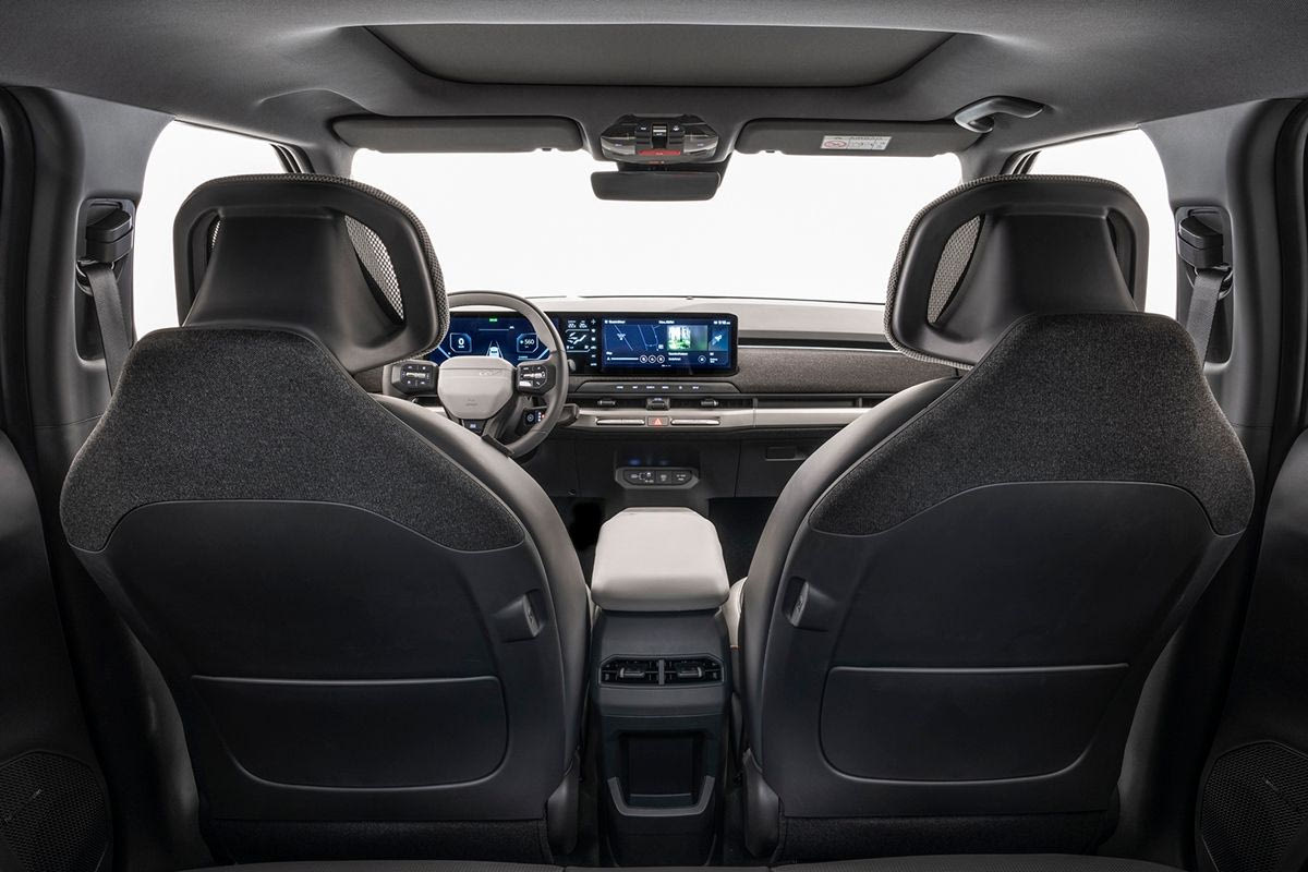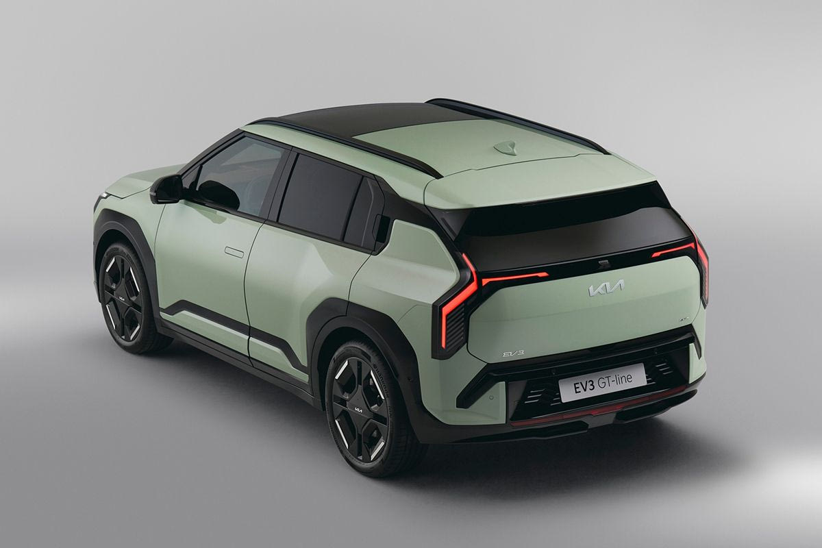 Η πίσω όψη ολοκληρώνει το νέο σχεδιασμό και τη δυναμική υπόσταση του EV3. Η μεγάλη, μαύρη διακοσμητική γραμμή που τονίζει τη σύνδεση μεταξύ της στιβαρής σχεδίασης της πίσω κολώνας C του SUV και της δυναμικής γραμμής οροφής ενισχύει περαιτέρω την αίσθηση ισχύος που αποπνέει το αυτοκίνητο. Ο απλοποιημένος, γεωμετρικός σχεδιασμός των πίσω φώτων ενσωματώνεται άψογα με το πίσω παρμπρίζ.
