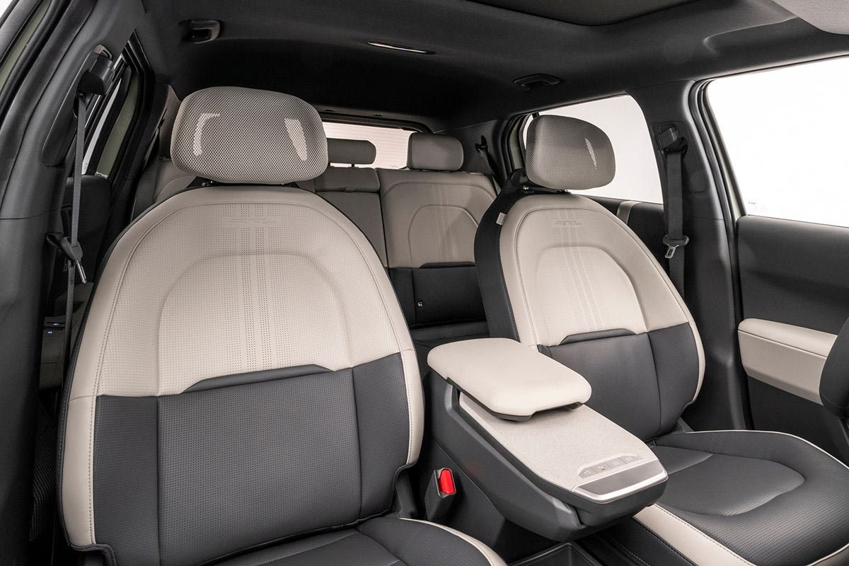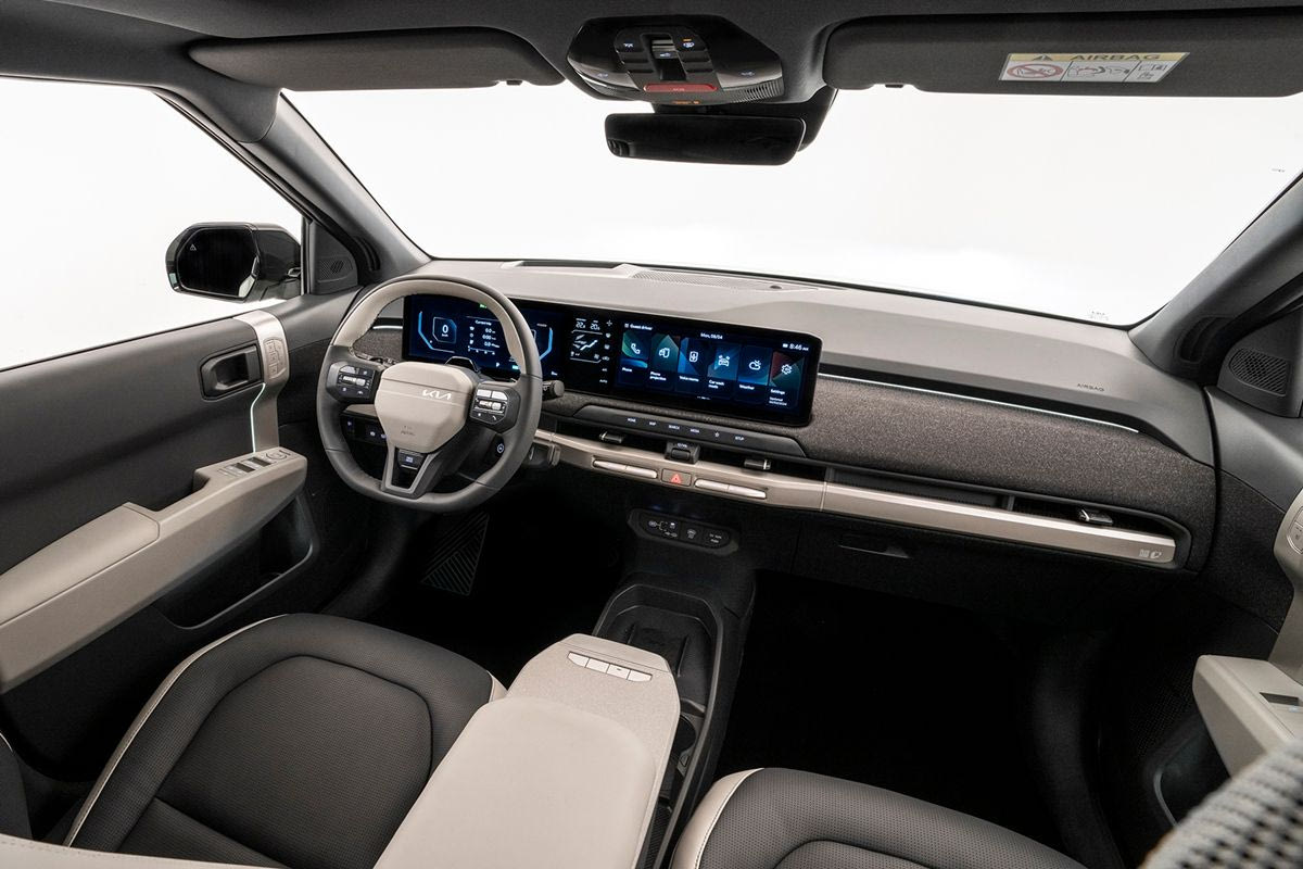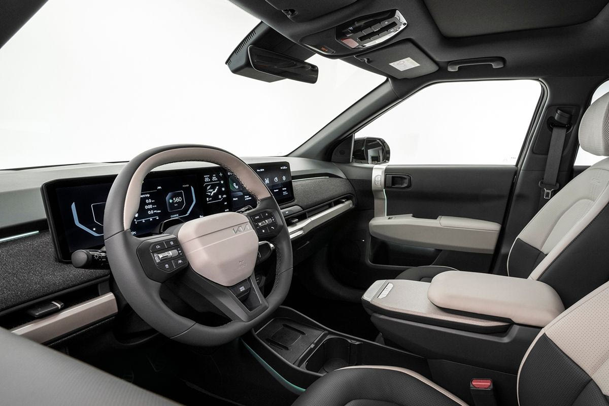 Στο εσωτερικό, ο σχεδιασμός του EV3 προσφέρει μια ευρύχωρη καμπίνα που φιλοξενεί άνετα πέντε άτομα. Παράλληλα η Kia δημιούργησε ένα ιδιαίτερα λειτουργικό εσωτερικό που αποπνέει μια ελκυστική ατμόσφαιρα ζωτικού χώρου, σχεδιασμένη για να την απολαμβάνουν οι επιβάτες τόσο σε κάθε ταξίδι όσο και όταν το αυτοκίνητο φορτίζει. Η κομψή κεντρική κονσόλα ενσωματώνει ένα συρόμενο τραπεζάκι και έναν αποθηκευτικό χώρο.
