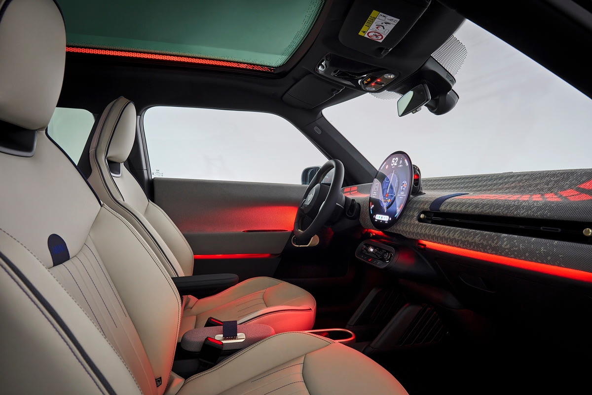 Το πλαίσιο της μάσκας και το λογότυπο σε γυαλιστερό μαύρο χρώμα υπογραμμίζουν τη δυναμική συνολική εμφάνιση, ενώ η οροφή με αντίθεση σε Chili Red – εμπνευσμένη από τον μηχανοκίνητο αθλητισμό – και οι ειδικές για το JCW ρίγες στο καπό σε κόκκινο ή μαύρο χρώμα προαιρετικά τονίζουν τον γνώριμο δυναμικό χαρακτήρα του MINI στο δρόμο.