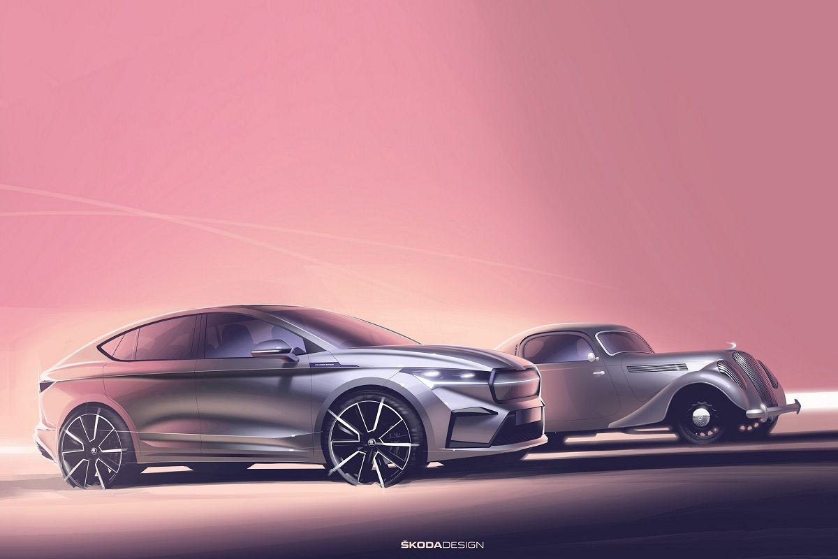 Στο δεύτερο σκίτσο, το ENYAQ Coupe iV ποζάρει δίπλα στο Skoda Popular Monte Carlo, ένα από τα ομορφότερα coupe που έχει κατασκευάσει ποτέ η τσεχική φίρμα.